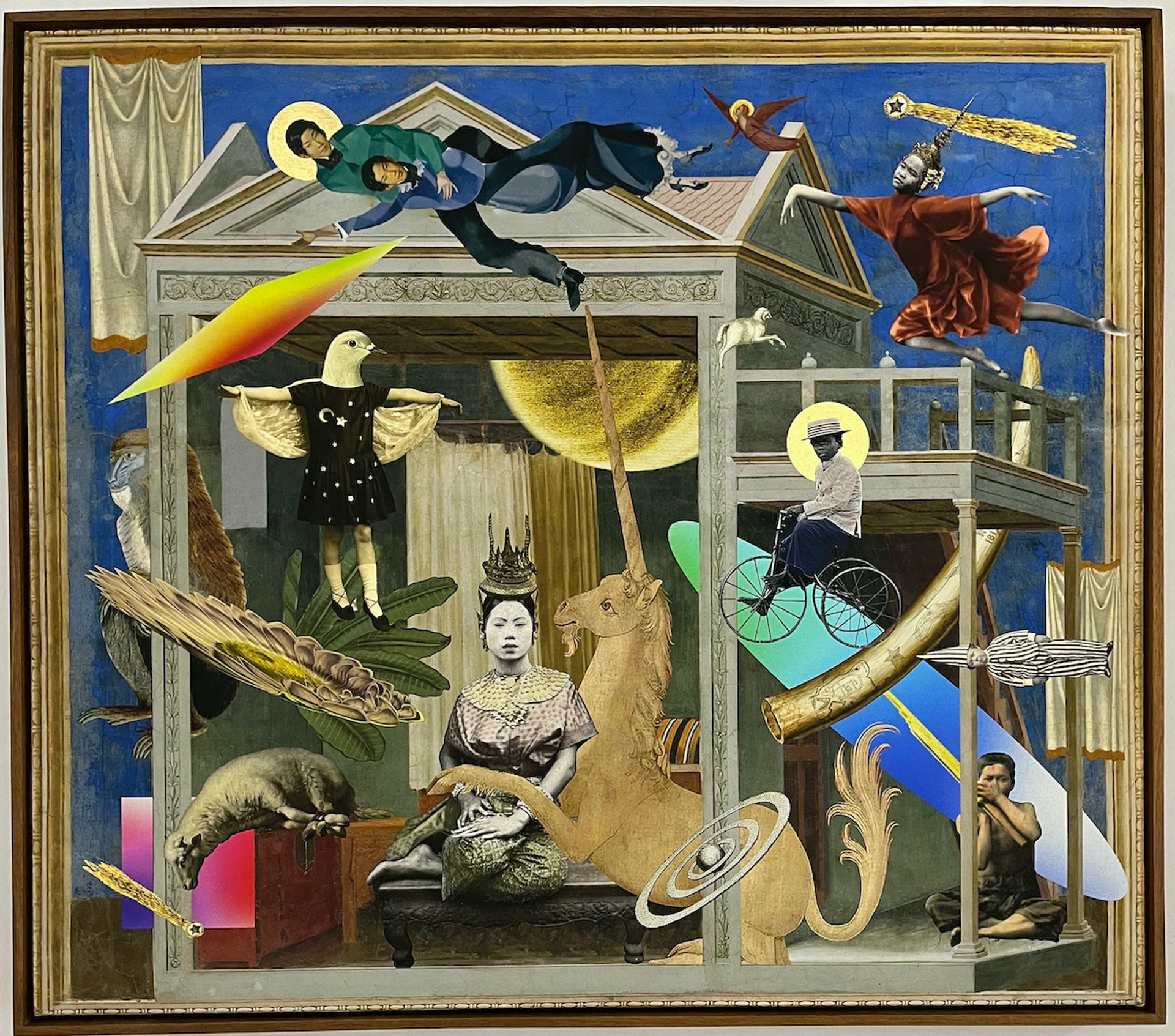 The Bangkok-based gallery Warin Lab Contemporary is showing A Unicorn in the Room (2024), a giclée print with digital collage by the emerging Thai artist Nakrob Moonmanas Courtesy of the artist and Warin Lab Contemporary