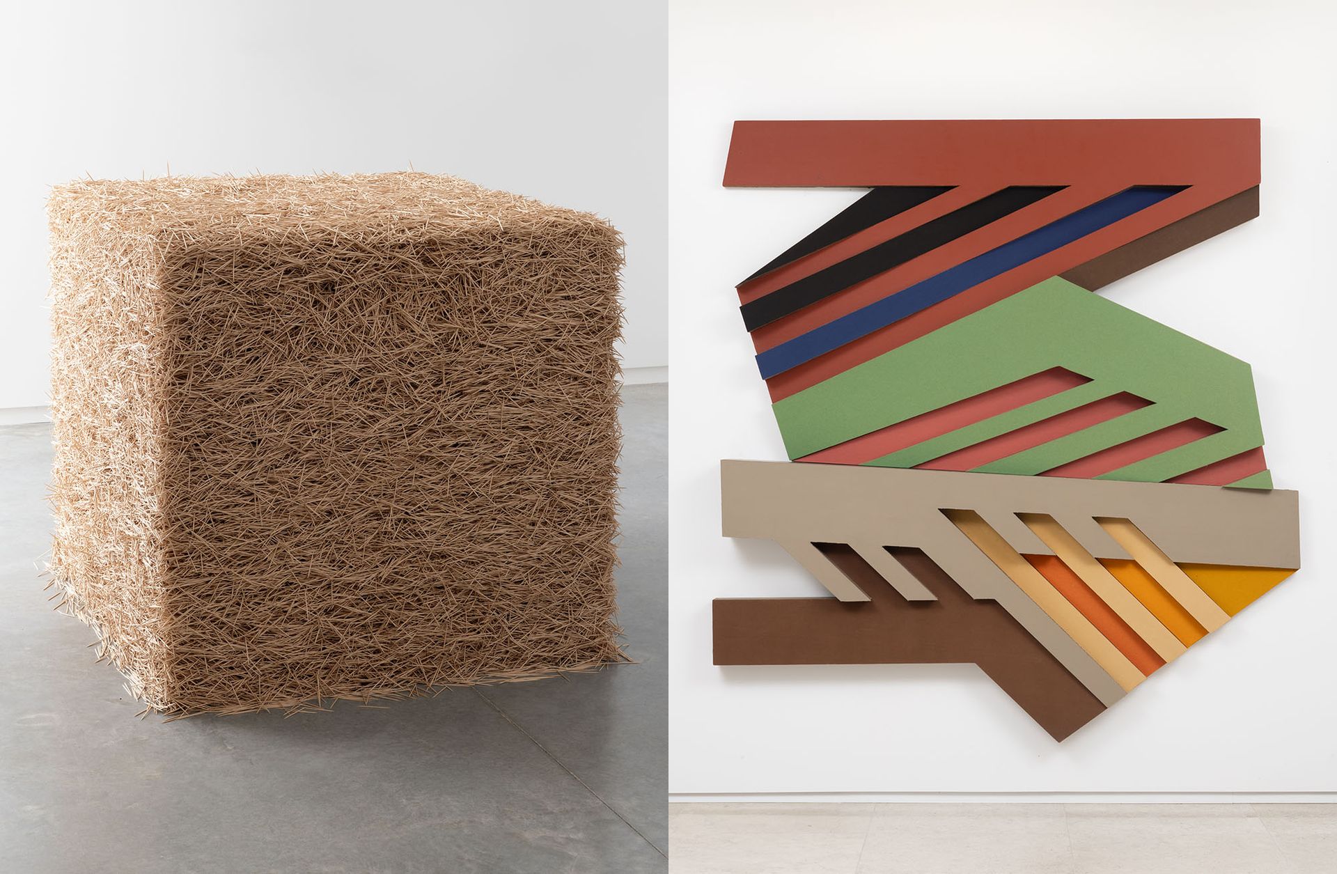 Left: Tara Donovan, Toothpicks, 2004. Right: Frank Stella, Piaski III, 1973 Donovan: Collection of the Vancouver Art Gallery, Promised Gift of Brigitte and Henning Freybe. Photo: Vancouver Art Gallery. Stella: Collection of the Vancouver Art Gallery, Promised Gift of Brigitte and Henning Freybe, © 2024 Frank Stella/Artists Rights Society (ARS), New York/CARCC Ottawa, Photo: Vancouver Art Gallery