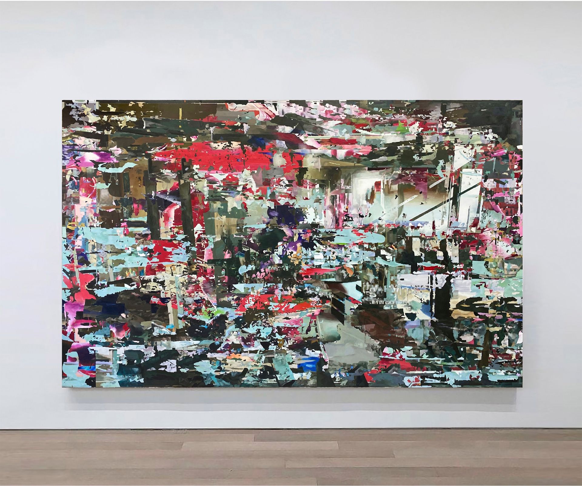 “There are parts of their paintings that from a distance appear as bit rot, fragments of digital information breaking down,” Uslip says. “It skips and slides and stutters across the picture plane. As you get closer it almost looks like confetti. There is a balance between utopia and dystopia. The magic of the paintings is how it flickers between these two.”