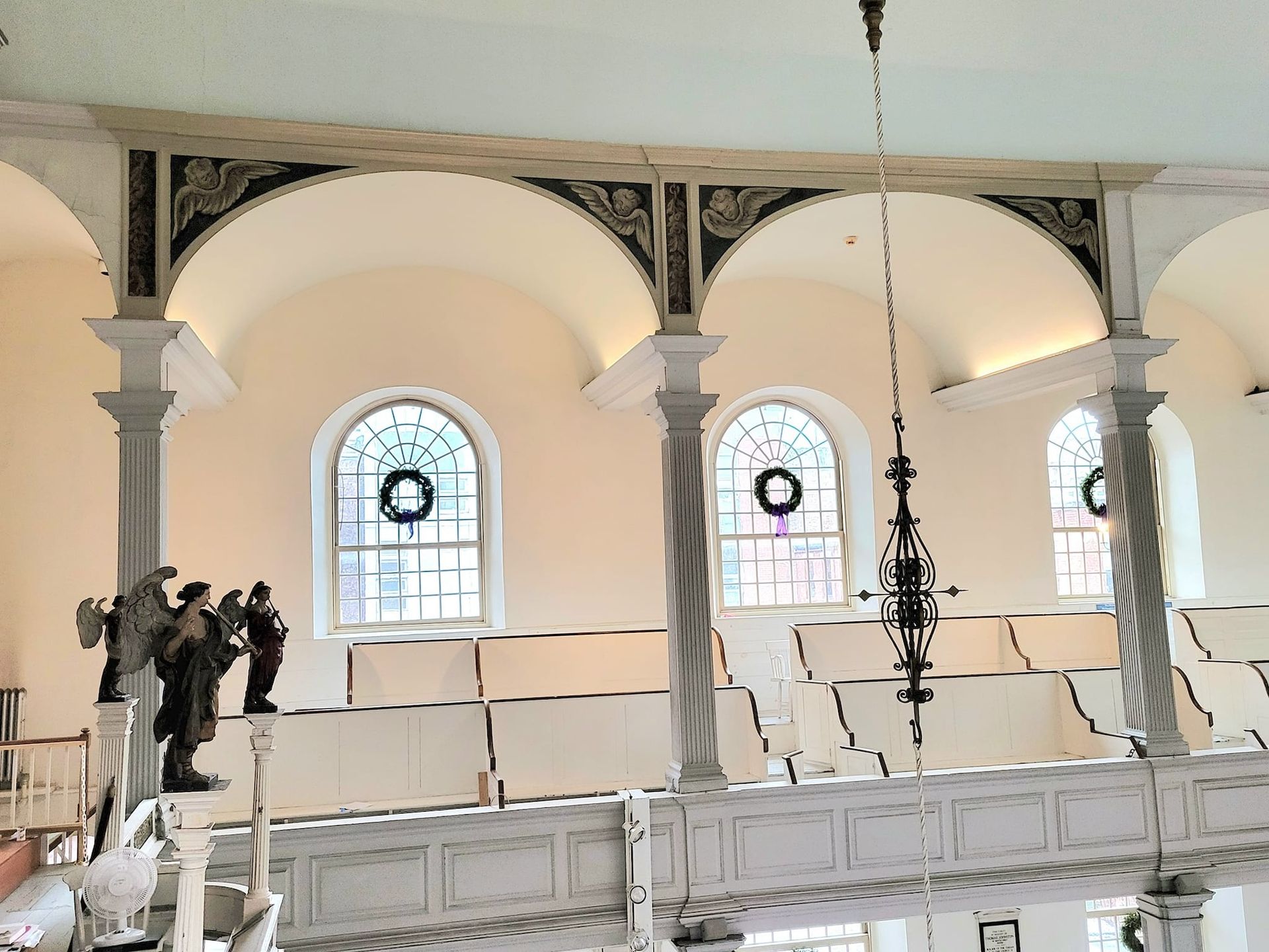 In advance of Old North’s 300th anniversary in 2023, the church began exploring opportunities to bring this centuries-old work to light. It tapped the historic-preservation firm Building Conservation Associates to conduct a paint study in 2016 and commissioned the conservator Gianfranco Pocobene to do the restoration work in 2024. The original plan was to reveal four angels, then replicate their design across the high arches. To their delight, a new path emerged.