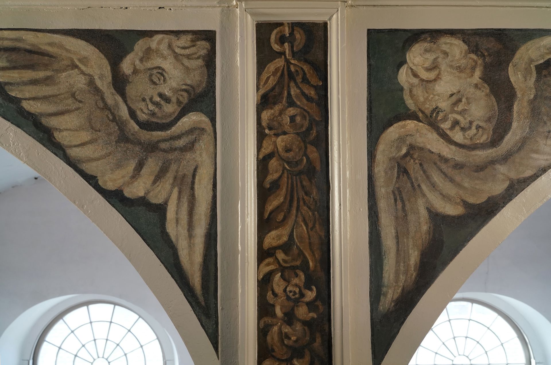 The festoons, painted on wood panels, were from a single template. Pocobene thinks they may have been made off-site and installed as finished pieces. However the cherubs, to everyone’s surprise, were not replicas but unique works, each angel with its own expression and personality. Their earthy muted tones, meant to mimic European stonework, were unexpectedly set against a rich teal background. The group agreed to reveal and restore the remaining cherubs in the high arches.