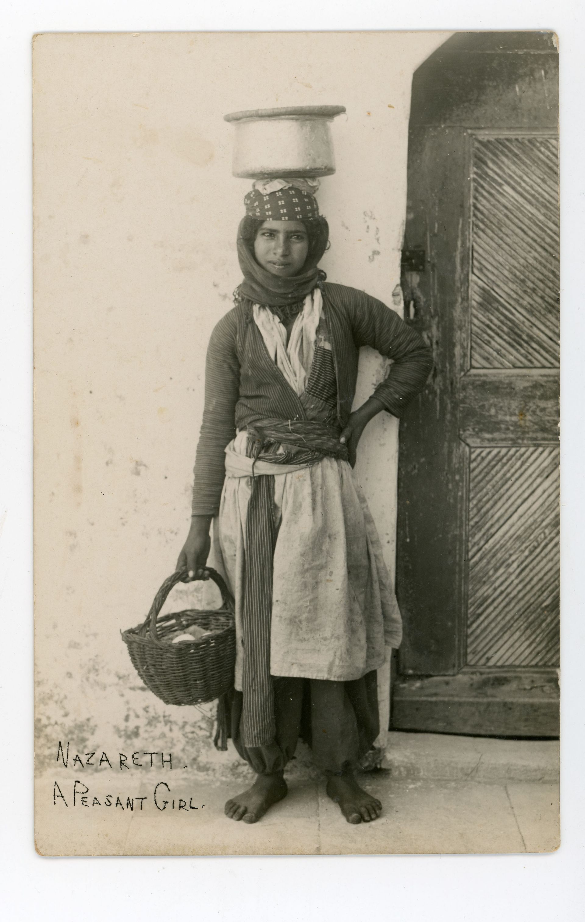 Karimeh Abbud, Nazareth, village girl carrying a basket of eggs, 1920-40 Bouky Boaz collection