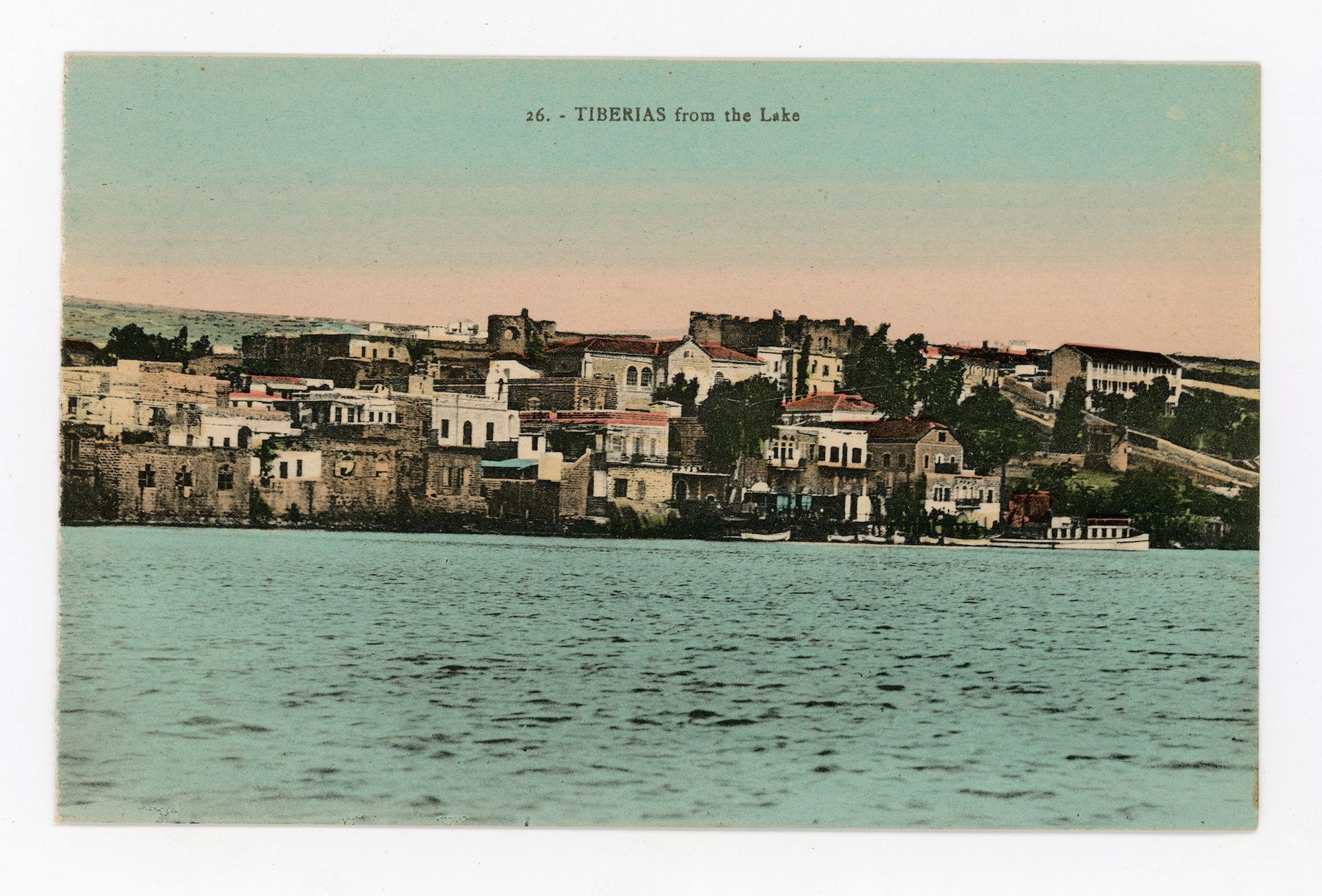 Karimeh Abbud, Tiberias, view from the Sea of Galilee, postcard #26 from the Souvenir of Palestine booklet, 1920-40 Bouky Boaz collection