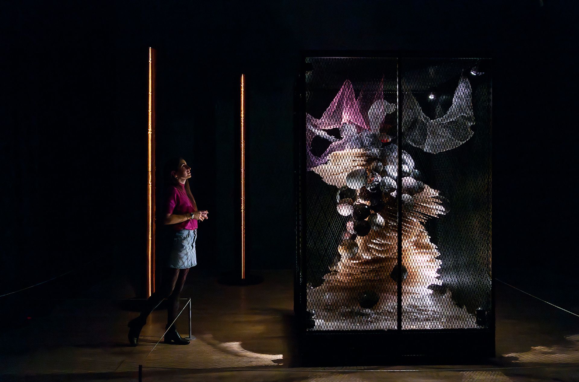 The Bride (1988) is in Electric Dreams: Art and Technology Before the Internet at Tate Modern. Made of mica with a flashing head, Lijn advises: “you don’t want to go into that cage because it’s charged with 500 volts” Photo: Lucy Green, © Tate
