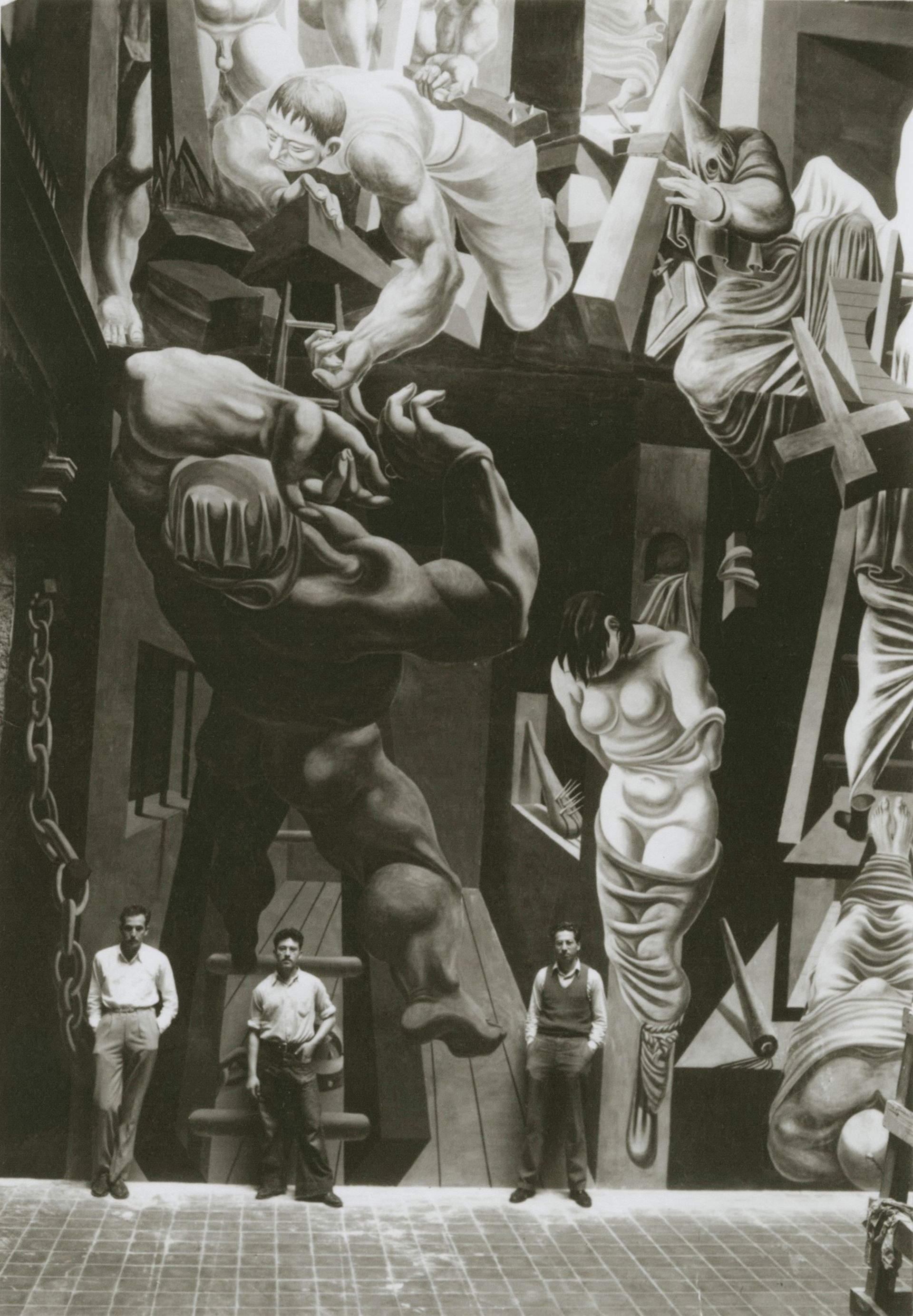 The huge work covers an entire wall of an inner patio and measures around 1,024 sq. ft. While Guston is credited by the scholar Ellen Landau as “probably responsible for devising the key imagery” and painting the most controversial elements including members of the Ku Klux Klan, Kadish secured the commission thanks to his previous work assisting David Alfaro Siqueiros.