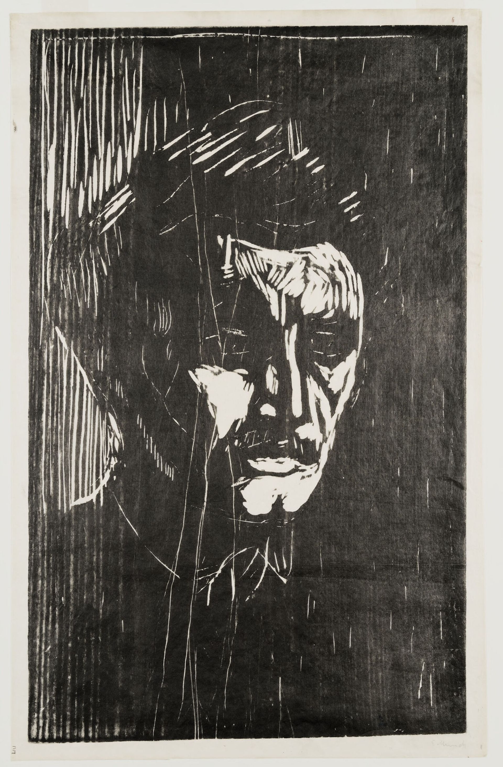 Edvard Munch, Self-Portrait, 1911–12. Woodcut with gouges on Japan paper. Harvard Art Museums/Fogg Museum, The Philip and Lynn Straus Collection Photo: © President and Fellows of Harvard College; courtesy of the Harvard Art Museums