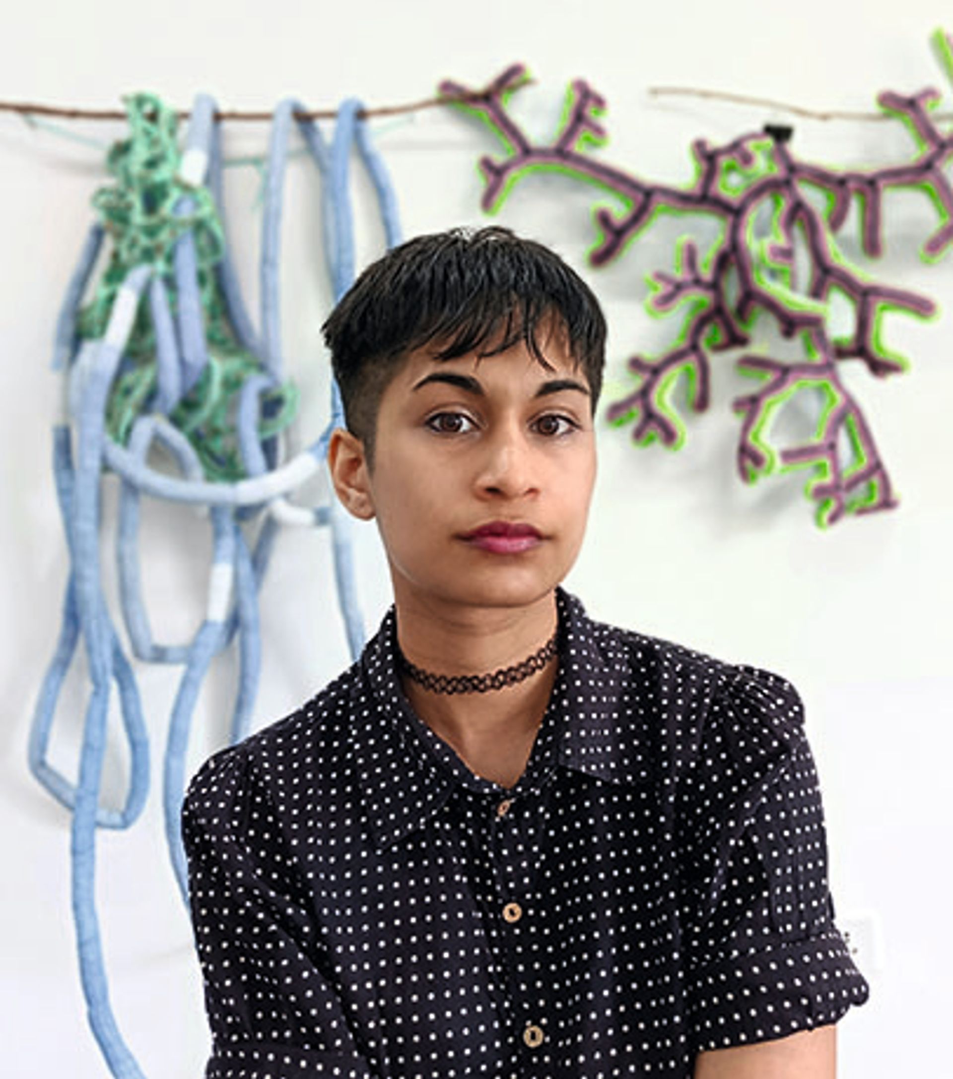 Imon Chetia Phukan works on her suspended fabric forest, a nod to her homeland in Assam Courtesy the artist