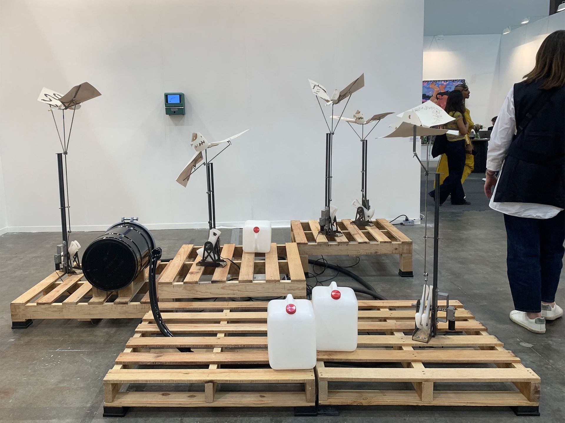 Another very timely, eye-catching commentary is on view at Proyectos Monclova’s stand, where the Mexico City-born artist Josué Mejía has unleashed a flock of cartoonish, prehistoric birds. His kinetic sculptural installation Presagios en vuelo sobre pisos de madera (Omens in flight over wooden floors, 2024)—with five mechanical birds made of paper with drawings on their wings and small dinosaur skulls for heads—is “a commentary on how all this, the art world, depends on fossil fuels”, says a Proyectos Monclova staffer. He adds that the work has been acquired by a US institution.