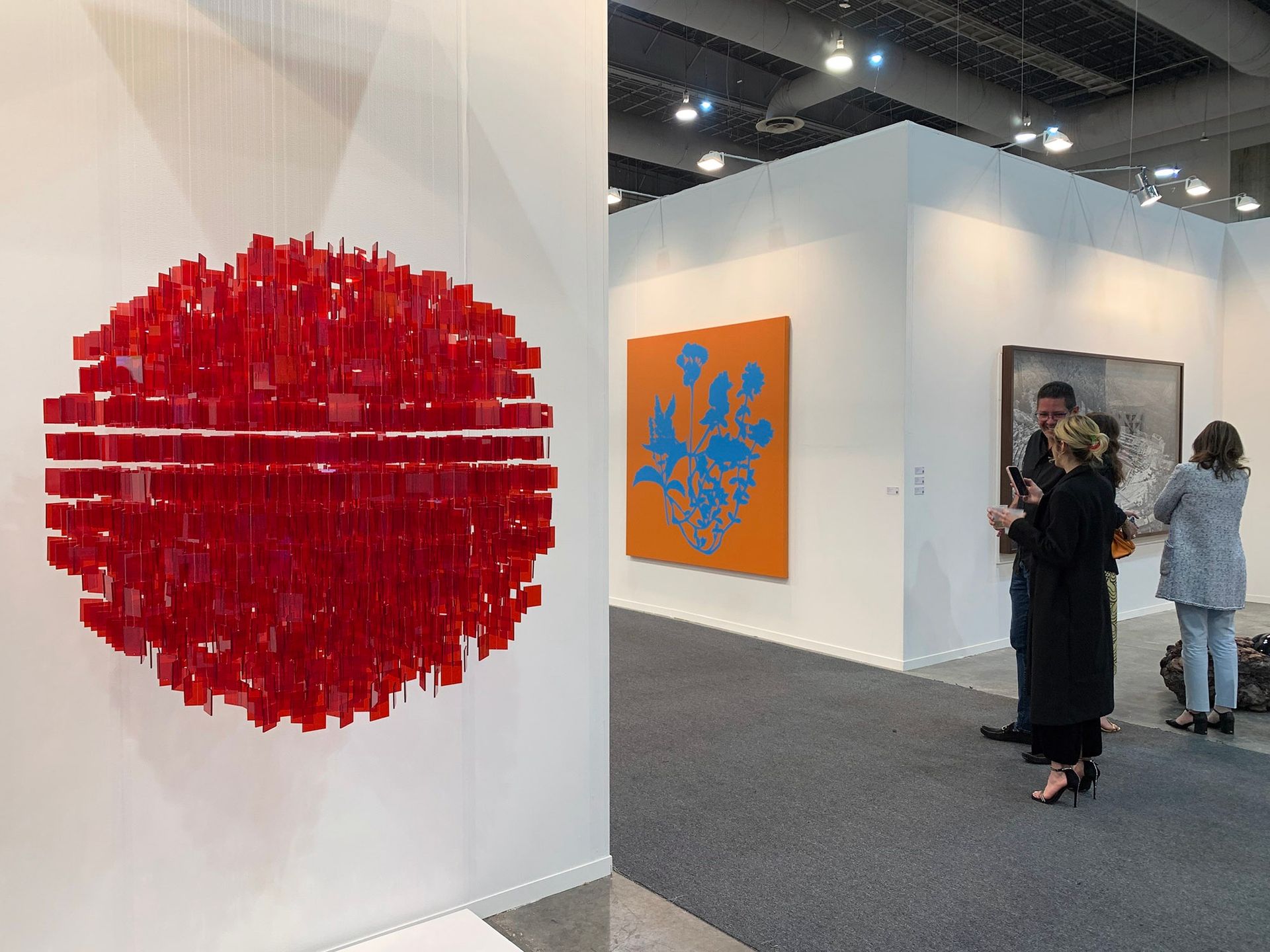 The Pace stand is a tribute to Mexico City's king of bold colour and geometric abstraction in architecture, Luis Barragán, with its bright-pink interior and warm orange exterior. The strategy appears to have paid off, with the gallery reporting a half-dozen sales during the VIP preview, including a work on paper by Nigel Cooke for $110,000, a painting by Kylie Manning for $100,000, a ceramic and steel sculpture by Arlene Shechet for $75,000 and three works on paper by Robert Nava for $40,000 apiece.
