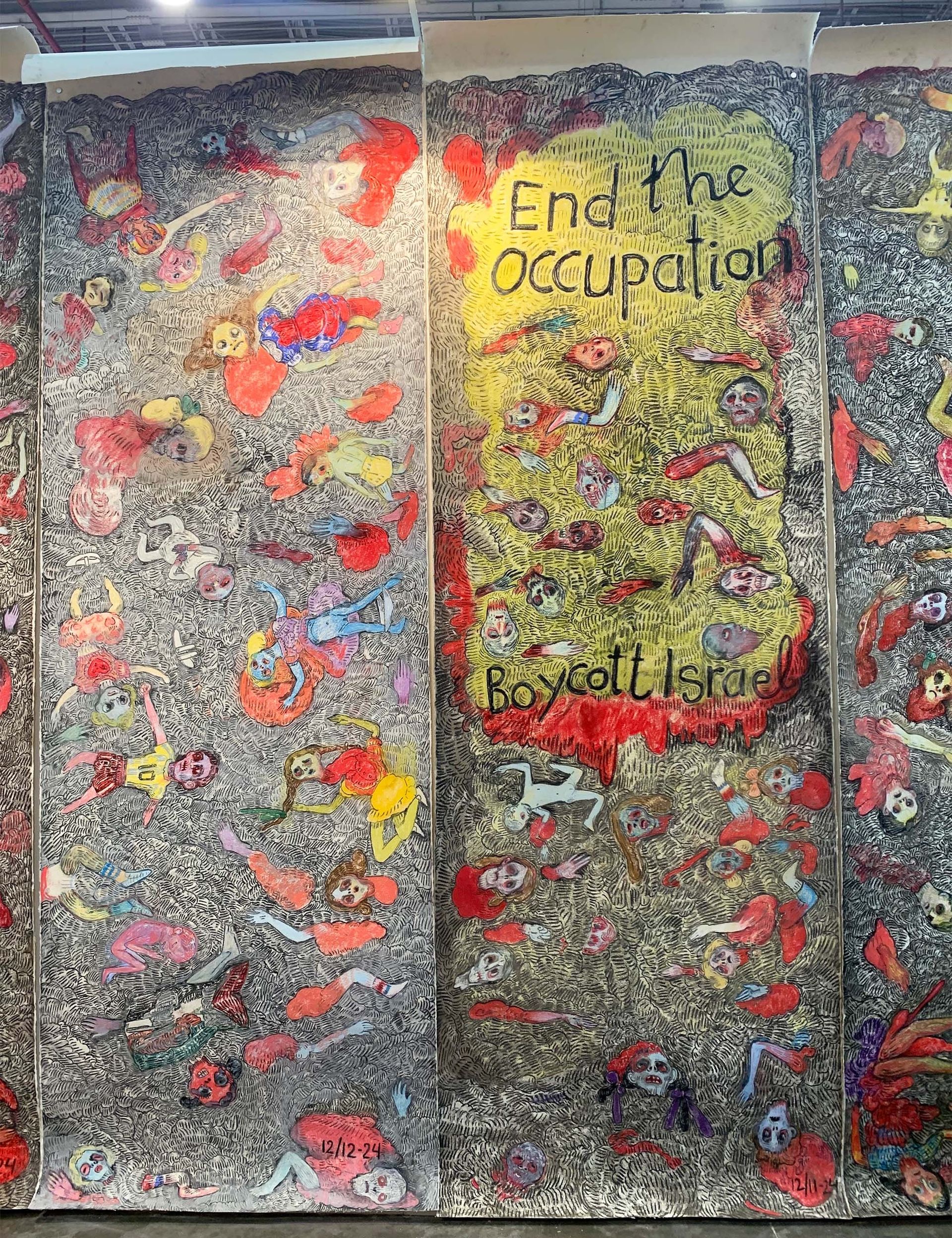 The artist, holding court amidst her drawings throughout VIP day, says the response to her installation had been largely supportive. “I’m not worried about how the work is received,” she says. “I’m worried about what’s happening in Gaza—this isn’t a war, it’s a massacre.”