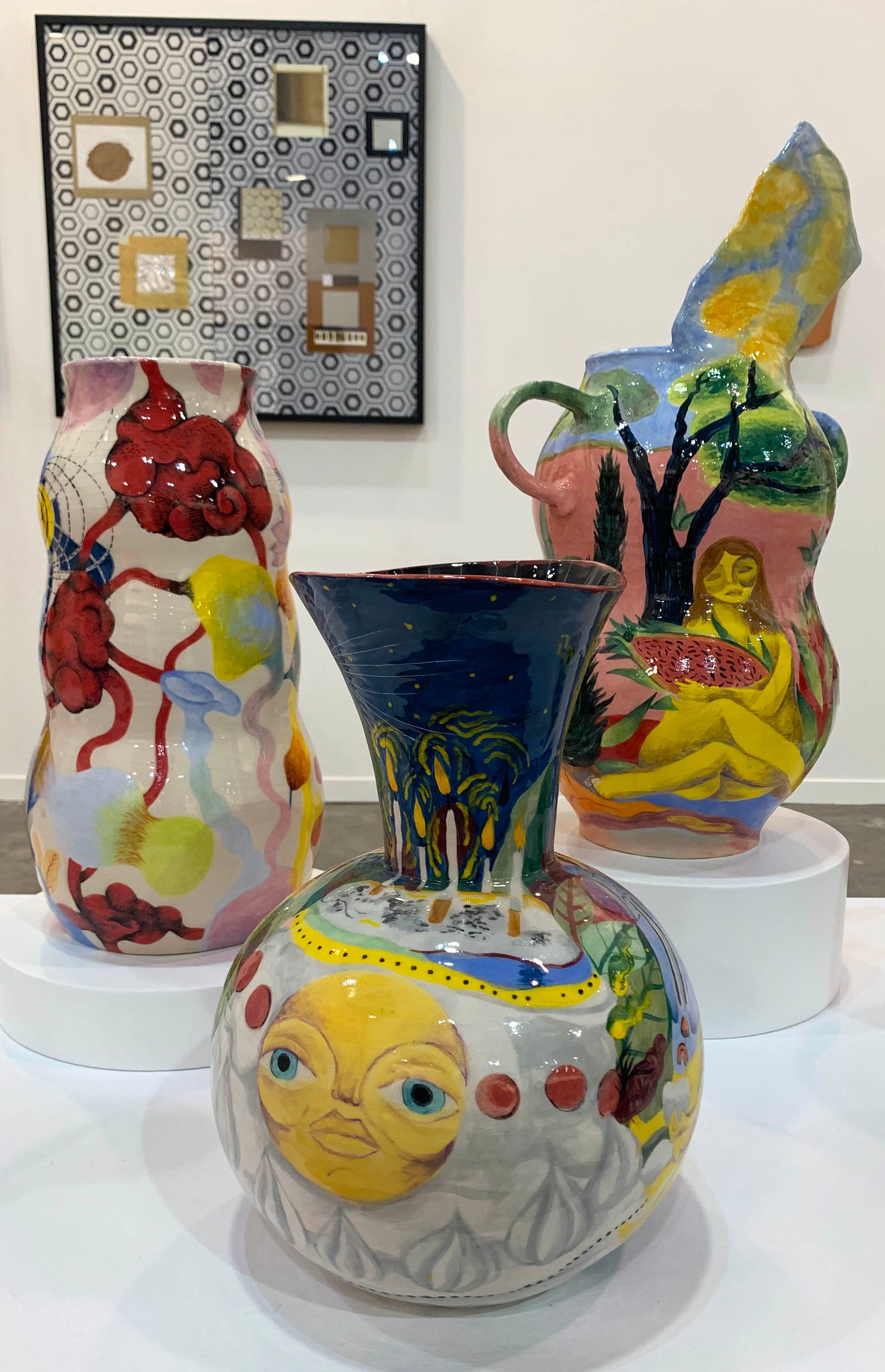 Ceramic works by Zeynep Solakoglu (foreground) and a collage by Seza Paker (background) on view in OG Gallery's stand at Zona Maco Benjamin Sutton