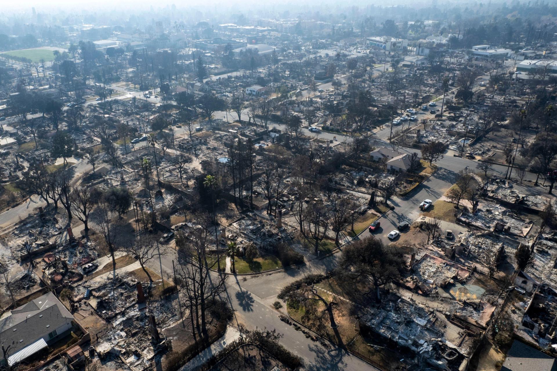 A drone captures the damage to buildings caused by the Eaton fire in Altadena. While insurance premiums are frozen this year, residents can expect substantial hikes in 2026 Photo: © Ringo Chiu/SOPA Images via ZUMA Press Wire; ZUMA Press Inc/Alamy Stock Photo