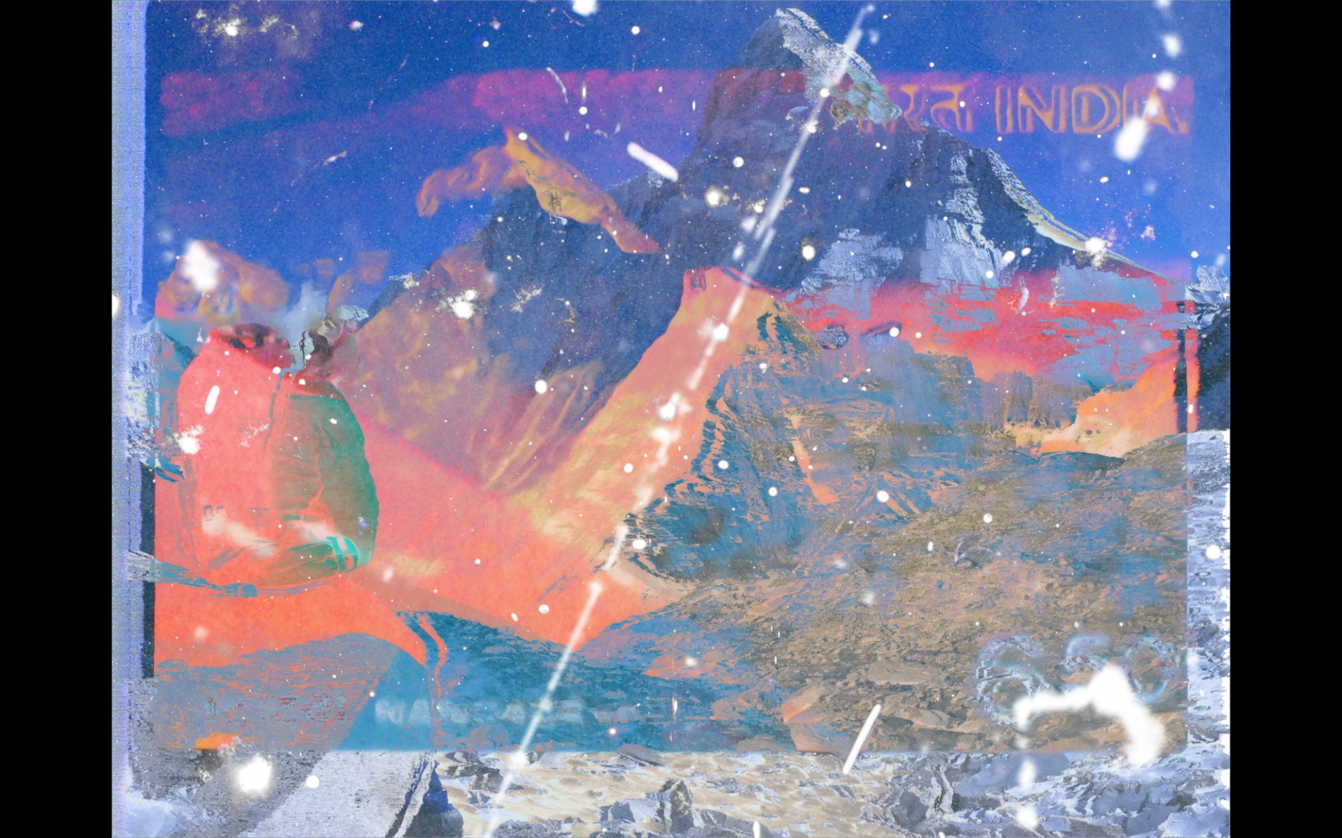 In Static Range, an imagined letter from the device to the mountain is played over a shifting, iridescent image of the mountain Nanda Devi, depicted on a postage stamp. “If you are a monument then I am violent, slowly violent, not the slowness that is the state of rest or thankfulness but the kind that feels like a fever in the heart, one that leaks into ritual, into belief,” the narrator says, menace dripping from her voice. A soundtrack of nagada drums, local to the region, plays like a statement of defiance behind her.