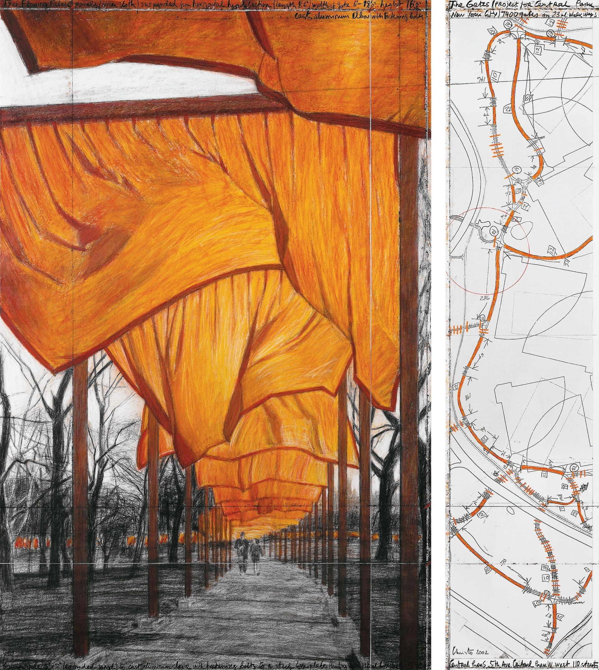 Twenty years have gone by since that installation was put up and taken down, and a commemoration of The Gates (12 February-23 March) is taking place at sites around Manhattan. Part of the celebration will take place at The Shed, where Christo and Jeanne-Claude: The Gates and Unrealized Projects for New York City includes drawings, models and components related to the 2005 installation. A scale model of Central Park will be on display, and through a specially designed iPad programme (developed by Pixels Pixels and Dirt Empire for The Shed exhibition) held over the map, viewers can get panoramic views of where the 7,503 gates were installed based on film of the site in 2005, as well as other information about the project.