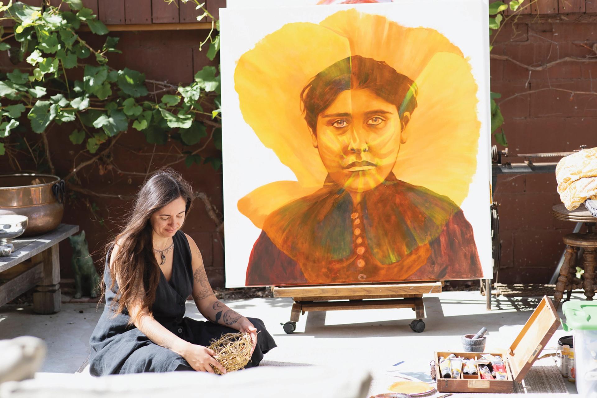 Weshoyot Alvitre, with her work CALIFORNIA NATIVE Dormidera #2: Modesta Avila (2023) Photo: Todd Westphal