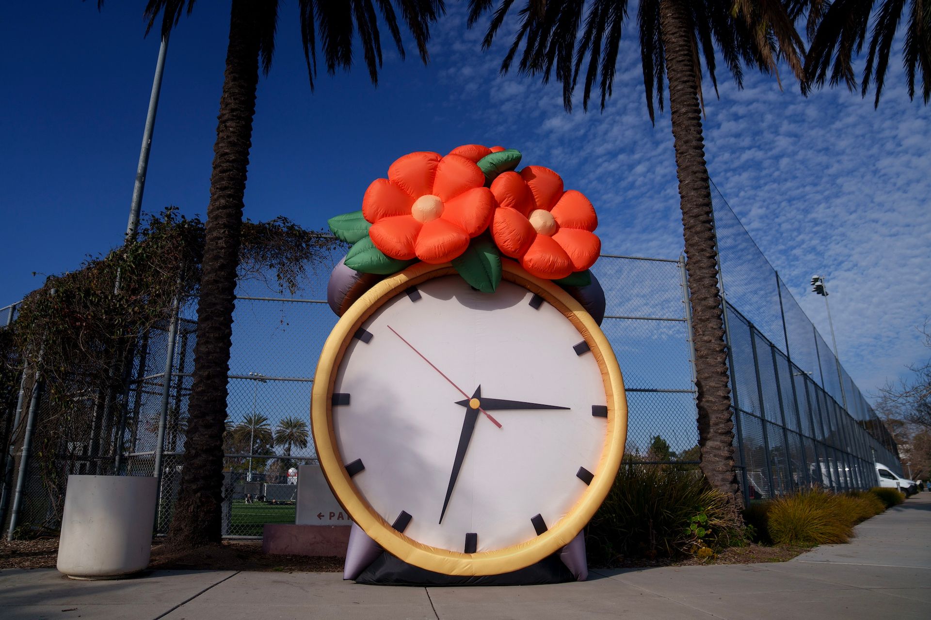 Ito created A Time to Blossom (2025) in collaboration with the Art Production Fund. He hopes that the huge alarm clock, with its crown of orange flowers, will unify the community and serve as a metaphor for healing, hope and transformation. (He adds that it could be a welcome distraction for stressed-out drivers looking for parking at the fair.)