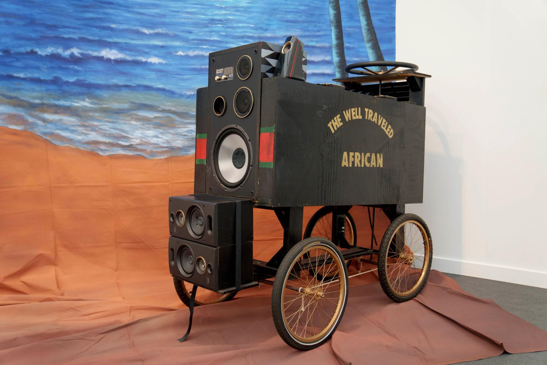 A version of Whyte’s musical installation was first exhibited at the 2016 Atlanta Biennial, while the Jamaica-born, Los Angeles-based artist was going through the process of naturalisation as a US citizen. It was the first year he could vote and he proudly cast his ballot for Barack Obama. The speakers on The Well Traveled African play a version of the theme song from the television show The Jeffersons, one of the few US shows available in Jamaica when Whyte was a child. The gallery is in talks with a US museum to acquire the $20,000 work.