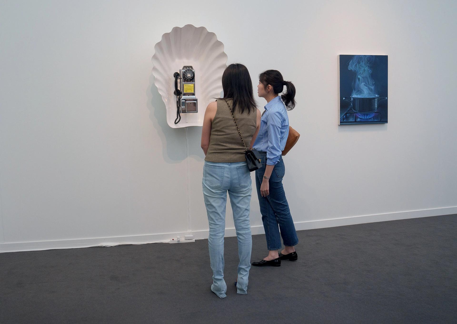 Frieze visitors are invited to pick up the receiver of Papademetropoulos’s vintage-payphone sculpture and listen to recorded ocean sounds and the Los Angeles-based artist having a conversation with her psychic. As the psychic talks about water, rainbows, lily pads, the sky and the universe, Papademetropoulos interjects every once in a while. “You like to keep water,” the psychic tells her. “We’re living in a morphing world.” The interactive sculpture has already sold, for an undisclosed price.