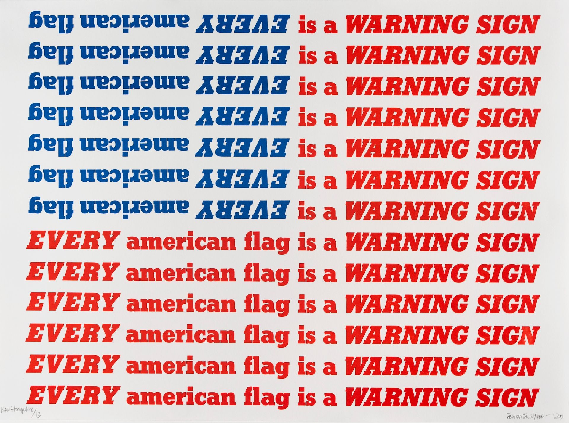 Within the Political section, for example, works move between highlighting the strategies of US imperial expansion and Indigenous political fortitude. A tower of wool blankets in Skywalker/ Skyscraper (Twins) (2020) by Marie Watt recalls the genocidal distribution of smallpox-infected blankets in the 18th century to Shawnee and Lenape communities while honouring the Haudenosaunee ironworkers who helped build New York's skyscrapers. Demian DinéYazhi''s my ancestors will not let me forget this (2020) reads "EVERY american flag is a WARNING SIGN" in red and blue, reproducing its own warning and reminding viewers that the emergence of this national symbol came with the attempted destruction of many other nations. Meanwhile, Modern Warrior Series: War Shirt #3—The Great Divide (2006) by Bently Spang speaks to a political world maintained in acts of social collectivity and cultural continuity.