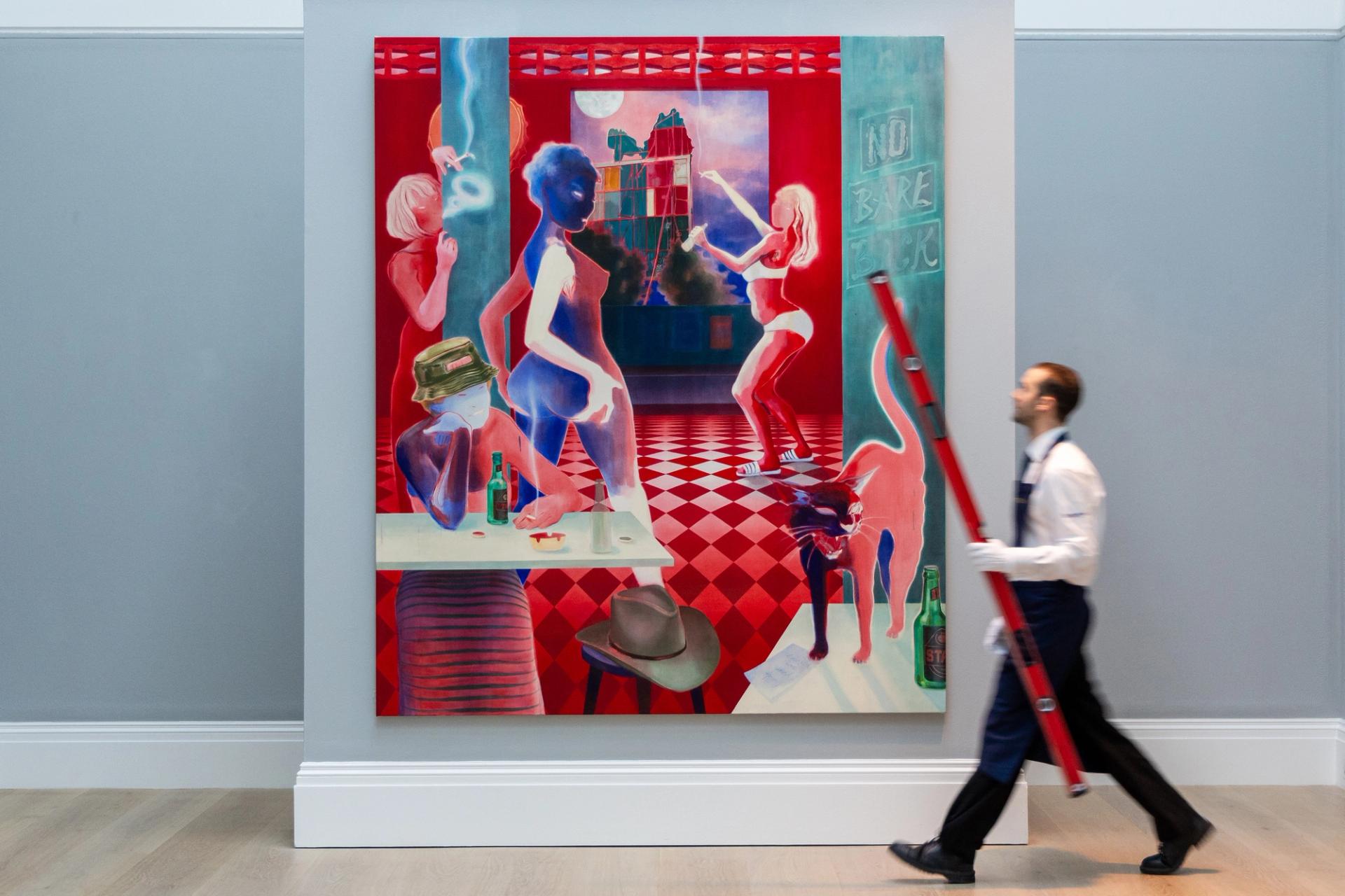 The monumental 2018 canvas, After Embah, by the admired London-based South African painter Lisa Brice was the surprise of the night. This surreal evocation of a seedy bar, mashing references to famous paintings of women by Édouard Manet with the image of the Trinidadian rapper Nicki Minaj in a defiant pose was a mesmerising challenge to the complacencies of the male gaze.