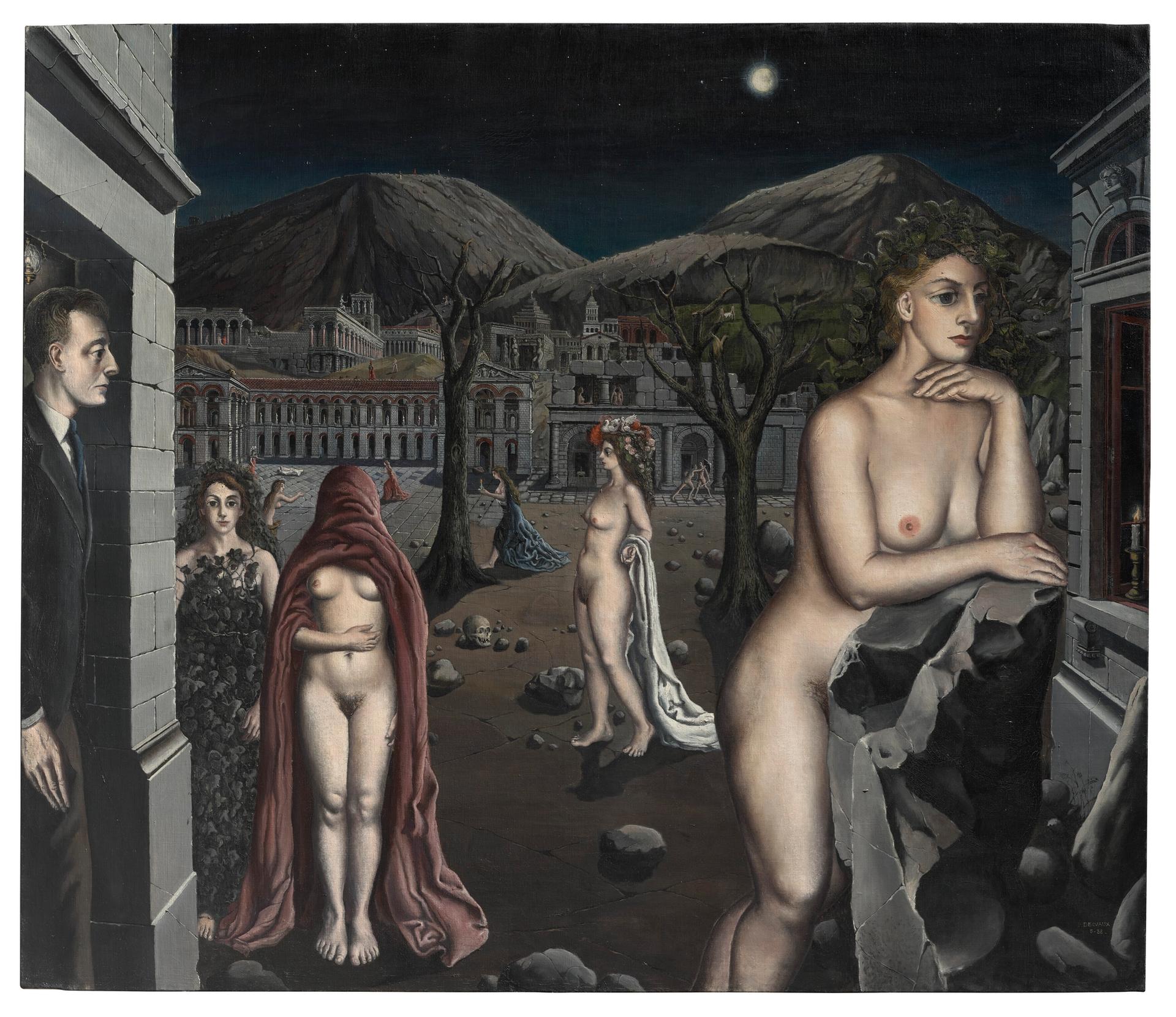 The impressively large painting, La ville endormie (1938), showing, in trademark Delvaux style, sleep-walking women in various states of undress against a backdrop of classical buildings and moonlit mountains, led the group at £6.2m (with fees). Coveted for its early date and the inclusion of a besuited self-portrait of the artist, this attracted at least seven determined bidders.