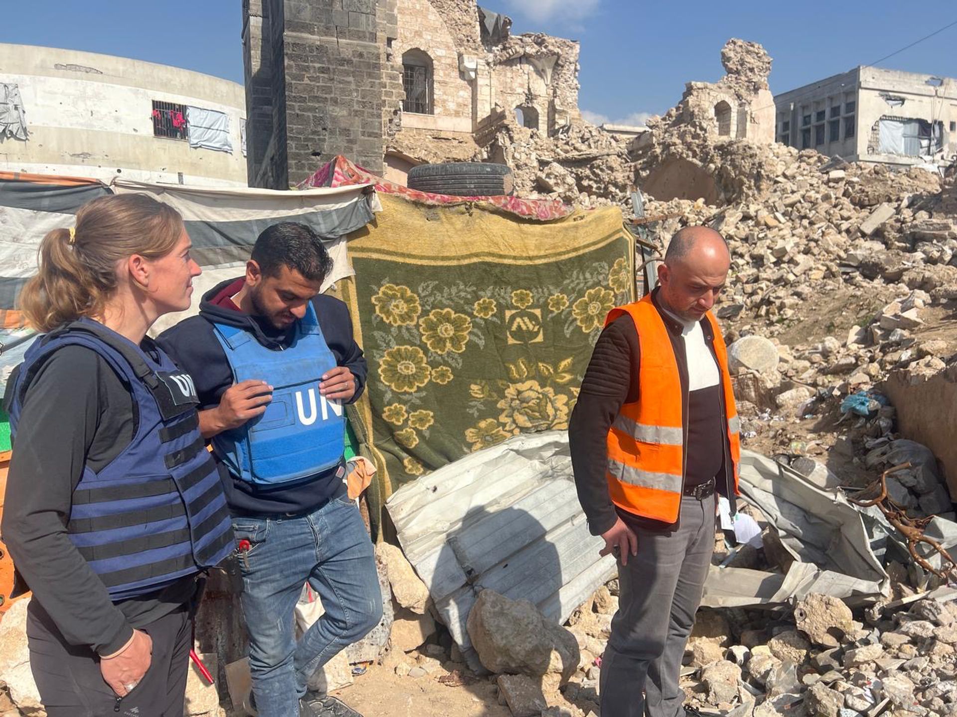 Hamoudeh Al-Duhdar, in orange vest, assisting UNMAS with the inspection of Al Pasha Palace for unexploded ordnance in February 2025 before commencing emergency rescue efforts © Centre for Cultural Heritage Preservation (CCHP)