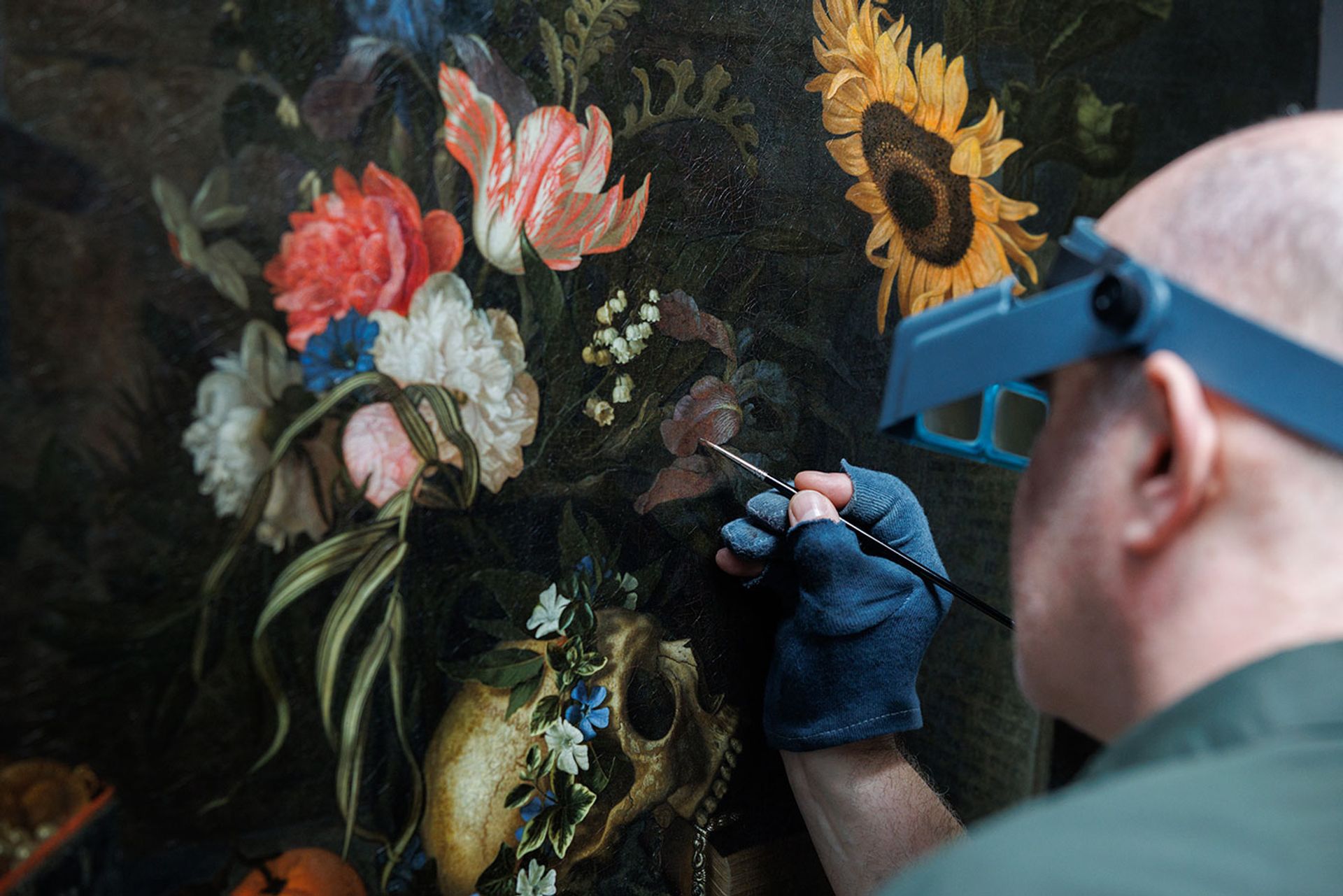Conservation work in progress on Maria van Oosterwijck's Vanitas Still Life. The painting, acquired in 2023, was installed in the Rijksmuseum collection after two years of research and conservation Rijksmuseum / Kelly Schenk