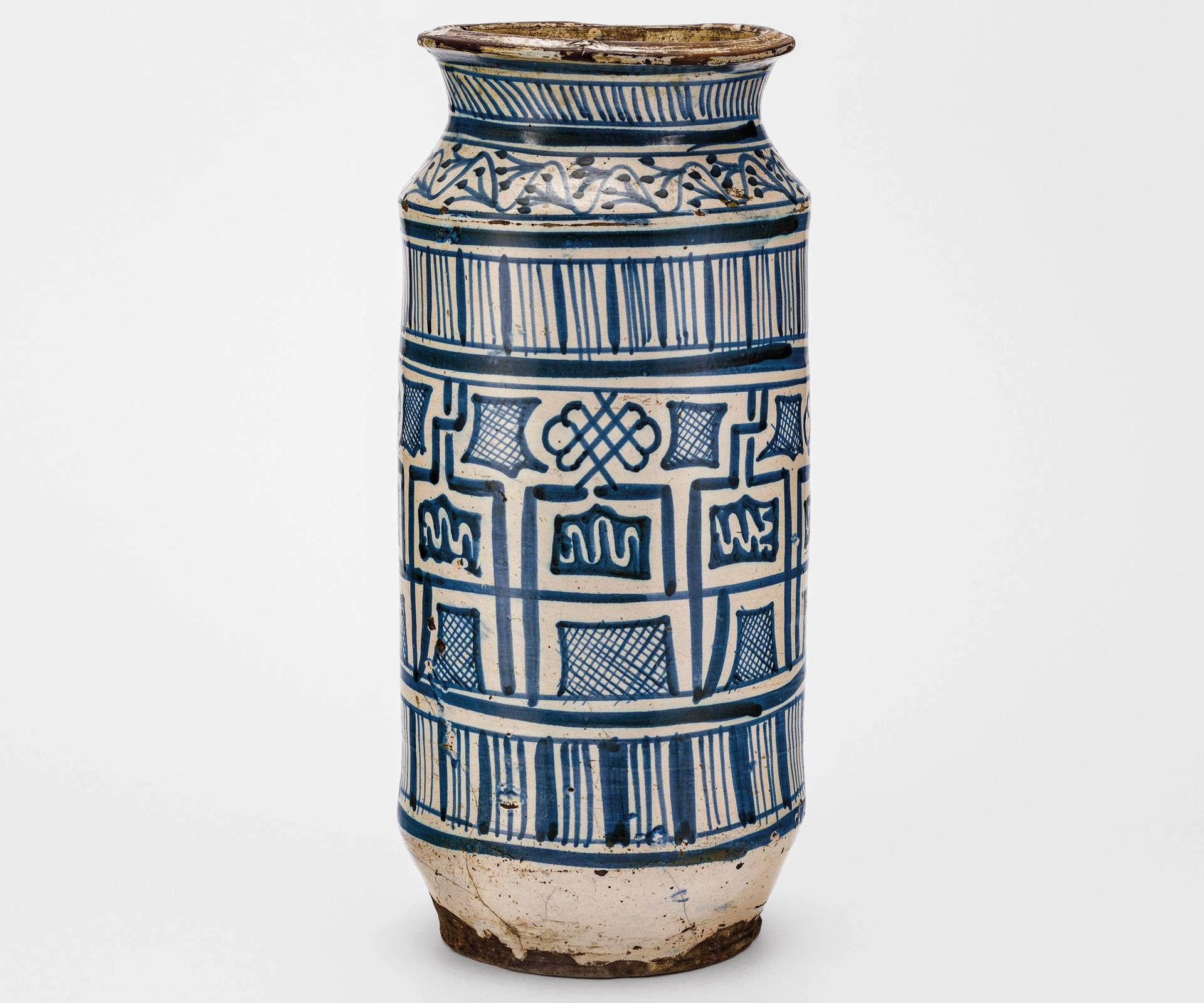 This albarello—an earthenware jar often used by apothecaries to store medicines—is one of a rare group known as Italo-Moresques, thought to originate in 15th-century Siena. Only 25 albarelli are known to feature this kind of blue-and-white pseudo-Kufic decoration, an imitation of Arabic calligraphy created by European artists influenced by Islamic design. This is one of the largest, at 33.5cm tall. Most other examples are held in major museums throughout the world.