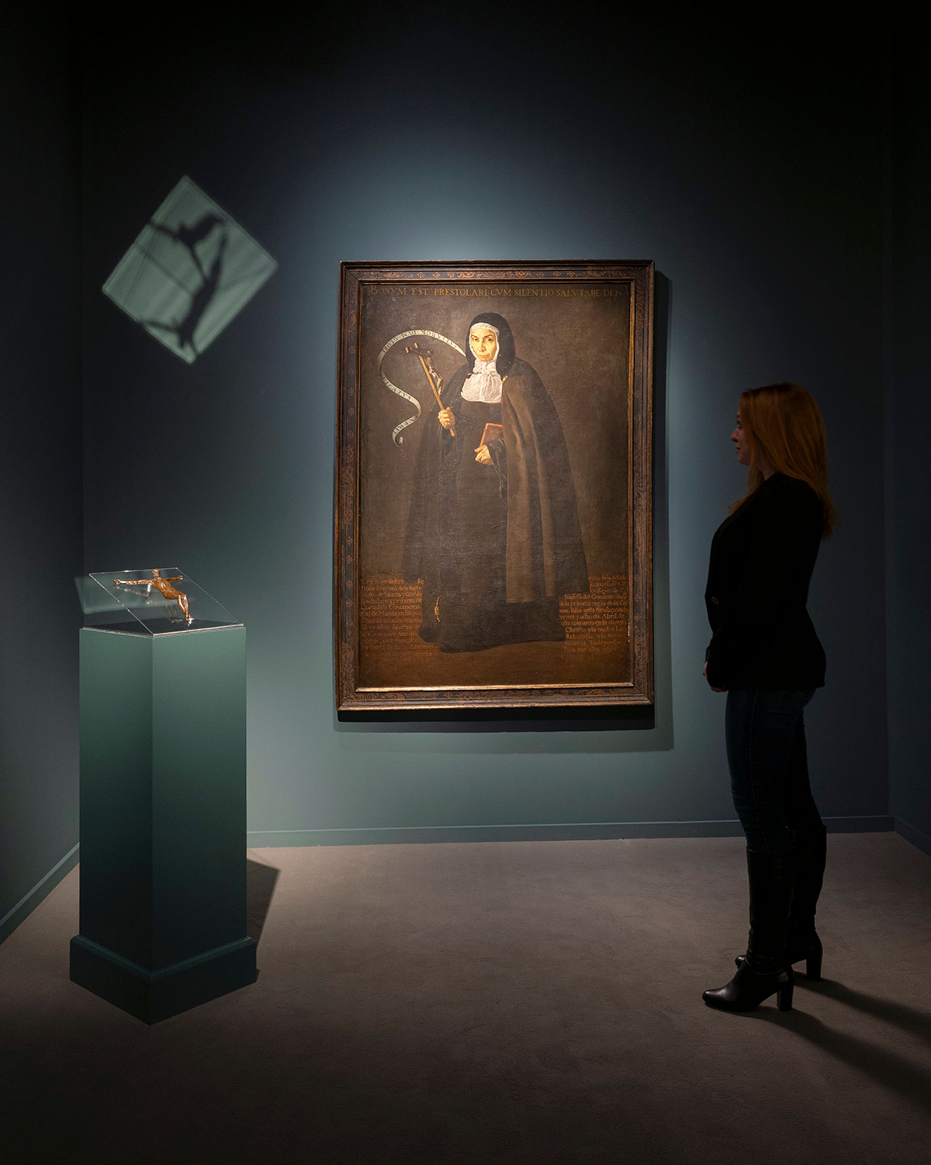 Another temporary import is the astonishing Velázquez, Mother Jerónima de la Fuente (1620), the portrait of a formidable-looking nun who would subsequently travel across the world to found the first convent in the Philippines. She is depicted holding—even brandishing—a bronze crucifix, and the London dealer Stuart Lochhead is also showing, alongside the portrait, a sculpture of the crucified Christ thought to be modelled by Michelangelo. While nothing would induce Lochhead to reveal the price of the Velázquez, the 25cm-high figure is tagged at €1.8m (£1.5m). It is one of two versions originally in a Toledo convent, the other being in the Prado, and so Sophie Richard of the gallery has hopes that it would be exportable from Spain for a foreign buyer, once the papers are completed.