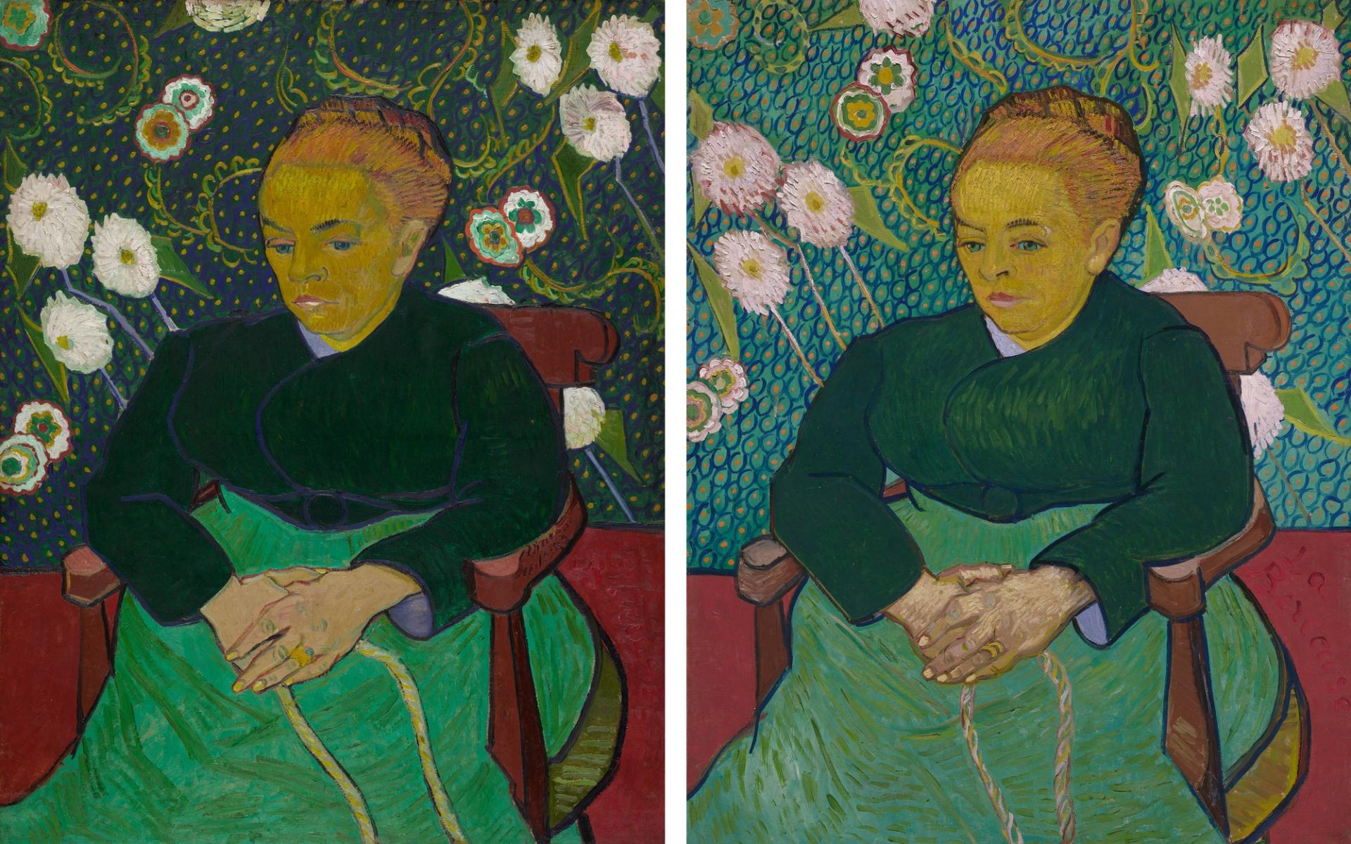 Research for the exhibition suggests that Van Gogh’s colours in the Boston portrait of Augustine have faded over the years. The greens in the upper background and the orange-red inscription “La Berceuse” on the red lower-right background, now barely visible in reproductions, would have been stronger. The pink parts of the flowers in the background have also faded, becoming whiter.