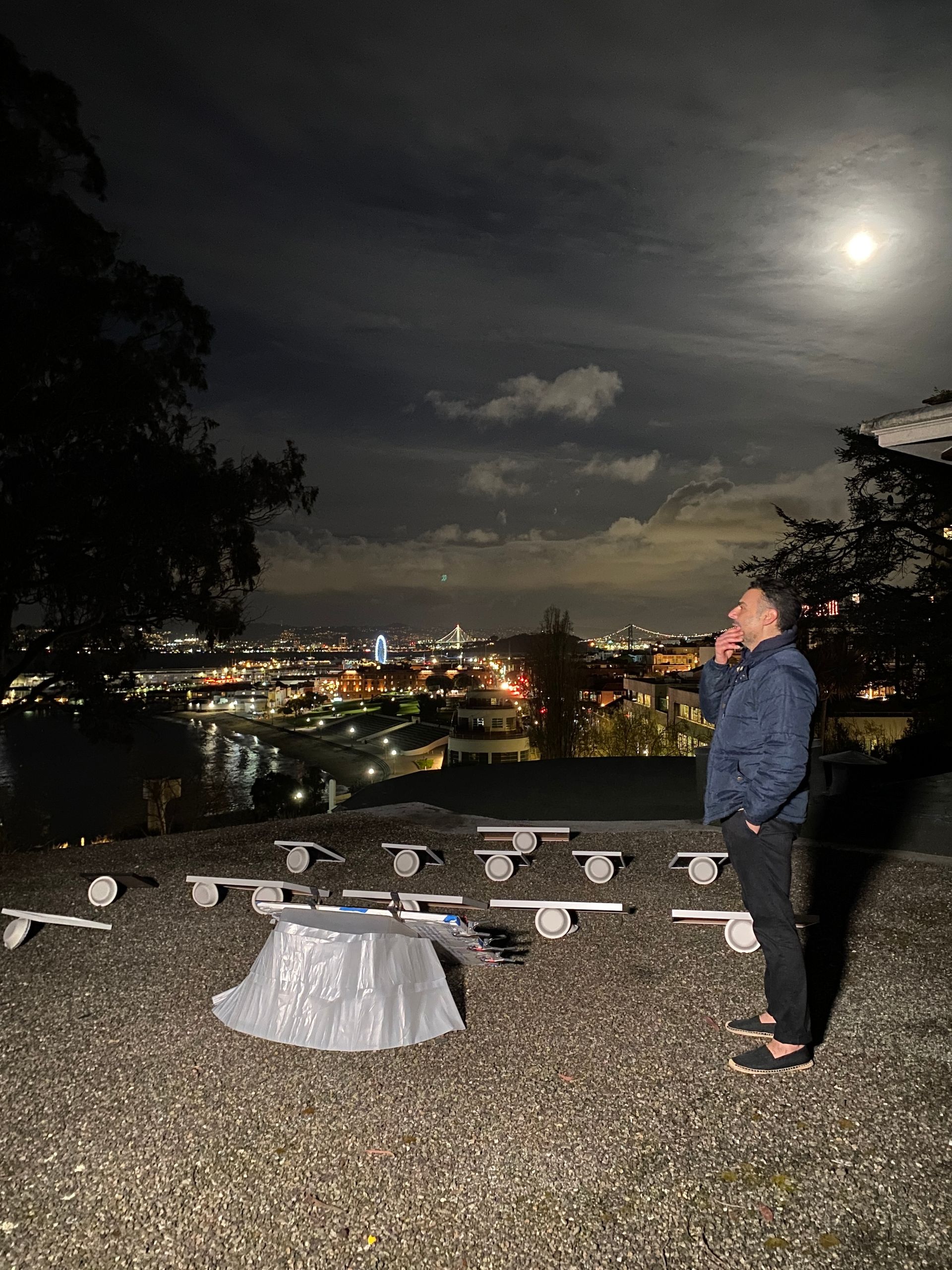 Or at least his work did. An assortment of plates, blooming with what at first might appear to be mould, were arrayed high up on a roof at Fort Mason, moon-and-star-bathing. It was a special night for such an activity—the moon, which had been full and radiant just hours before, was slowly transforming into a crescent during a partial lunar eclipse.