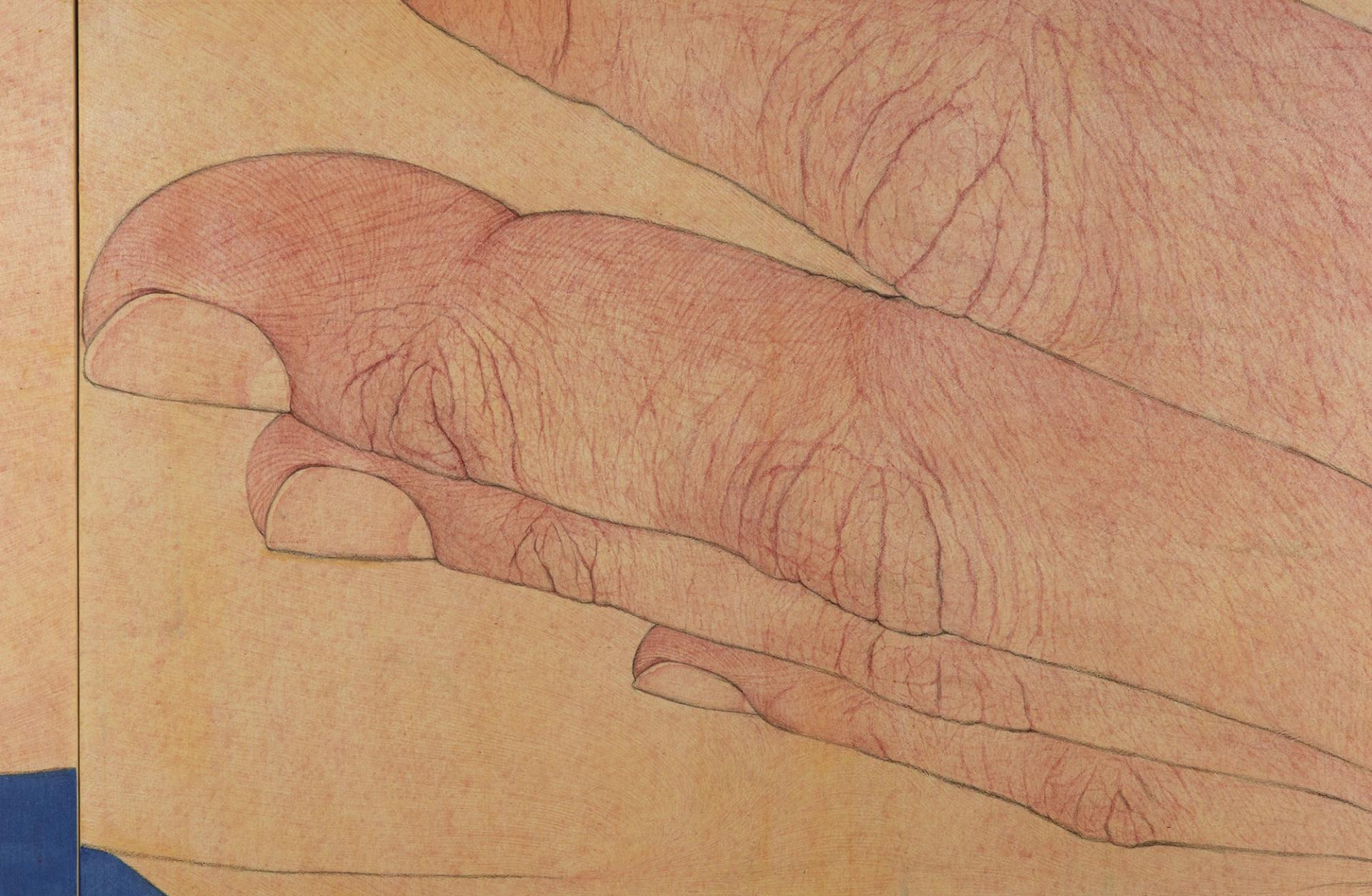 Paik’s paintings in the show reveal details of the human body that are often neglected in portraiture—the creases of knuckles, blue veins running beneath the skin and shifting pigments on nipples, hands and feet. The results in Body Cartography are large, lifelike and intimate self-portraits, with deep jewel-tone backgrounds. One of the most impressive works in the show by sheer scale is Map: Azure Blue (2025), a set of six panels that stretches more than nine meters wide and three meters tall, showing Paik’s feet, legs, belly, breasts and hands from her point of view. The works in Body Cartography are priced from $15,000 to $100,000 each.