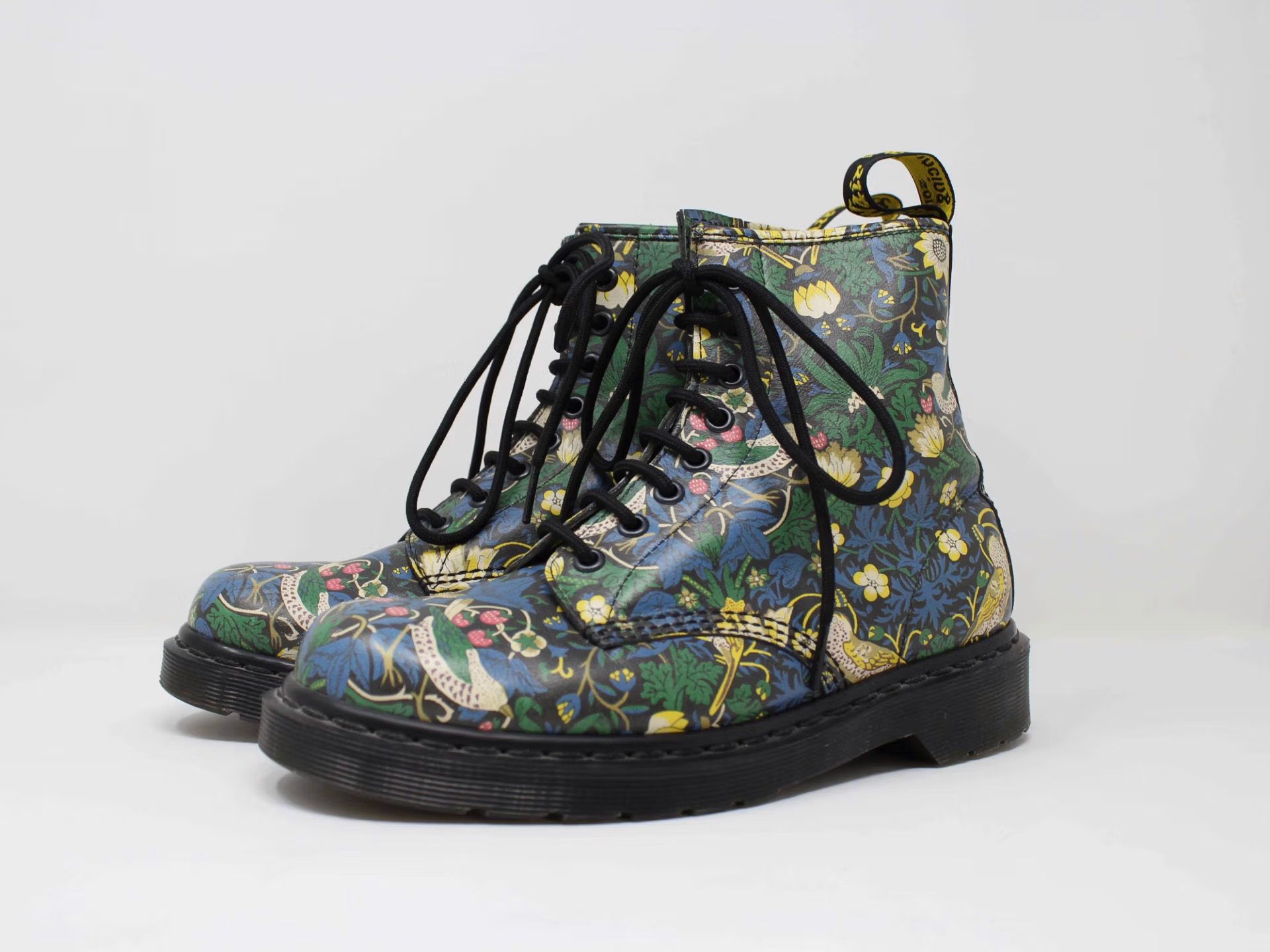 Dr Martens boots decorated with William Morris’s “Strawberry Thief” pattern