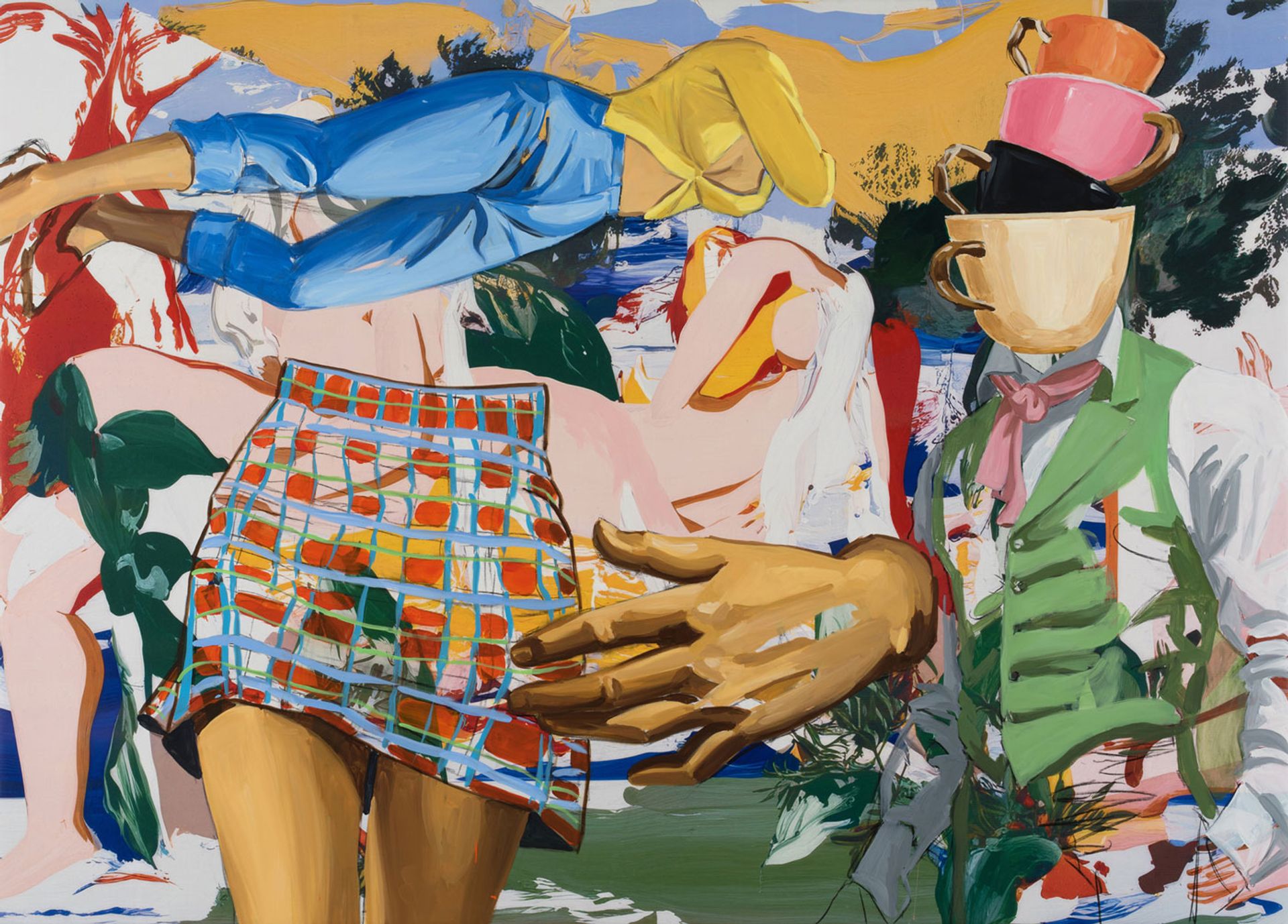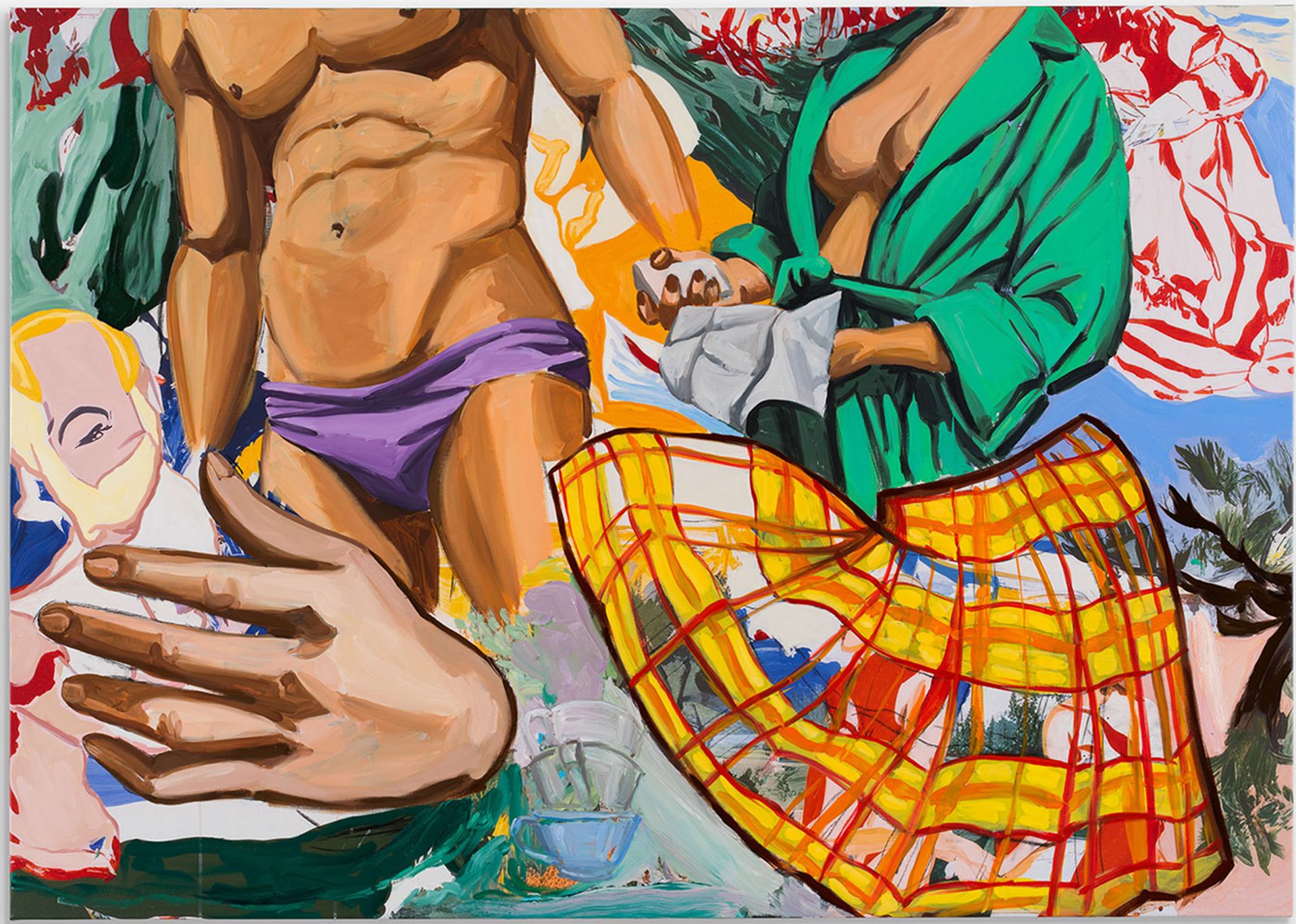 Salle has taken these images generated “with the machine”, printed them on linen as backdrops and then, working in response to them, has painted overlapping, dramatised groupings of vividly pigmented everyday objects: fragmented figures, male and female, in bathing suits or sun dresses; disembodied arms and forearms; plaid skirts and bikinis. The finished works are tinged with Salle’s trademark ambiguity and a lurking social anomie, expressed in a knowing post-Pop art play. They carry mordant references to the commercial illustrator or cinema poster artist’s take on the American Dream, which was embedded within Salle’s 1950s childhood in the US Midwest. This new body of paintings is collected together in Some Versions of Pastoral, at Thaddaeus Ropac in London, the latest works in a corpus first shown at the Gladstone Gallery in New York in 2024.