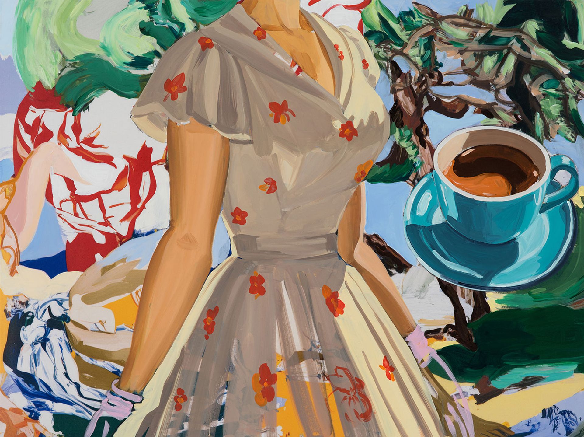 David Salle, Blue Coffee (2025), oil; acrylic; flashe; and charcoal on archival UV print on linen © David Salle / ARS New York, 2025. Photo: John Behrens. Courtesy Thaddaeus Ropac gallery, London · Paris · Salzburg · Milan · Seoul.