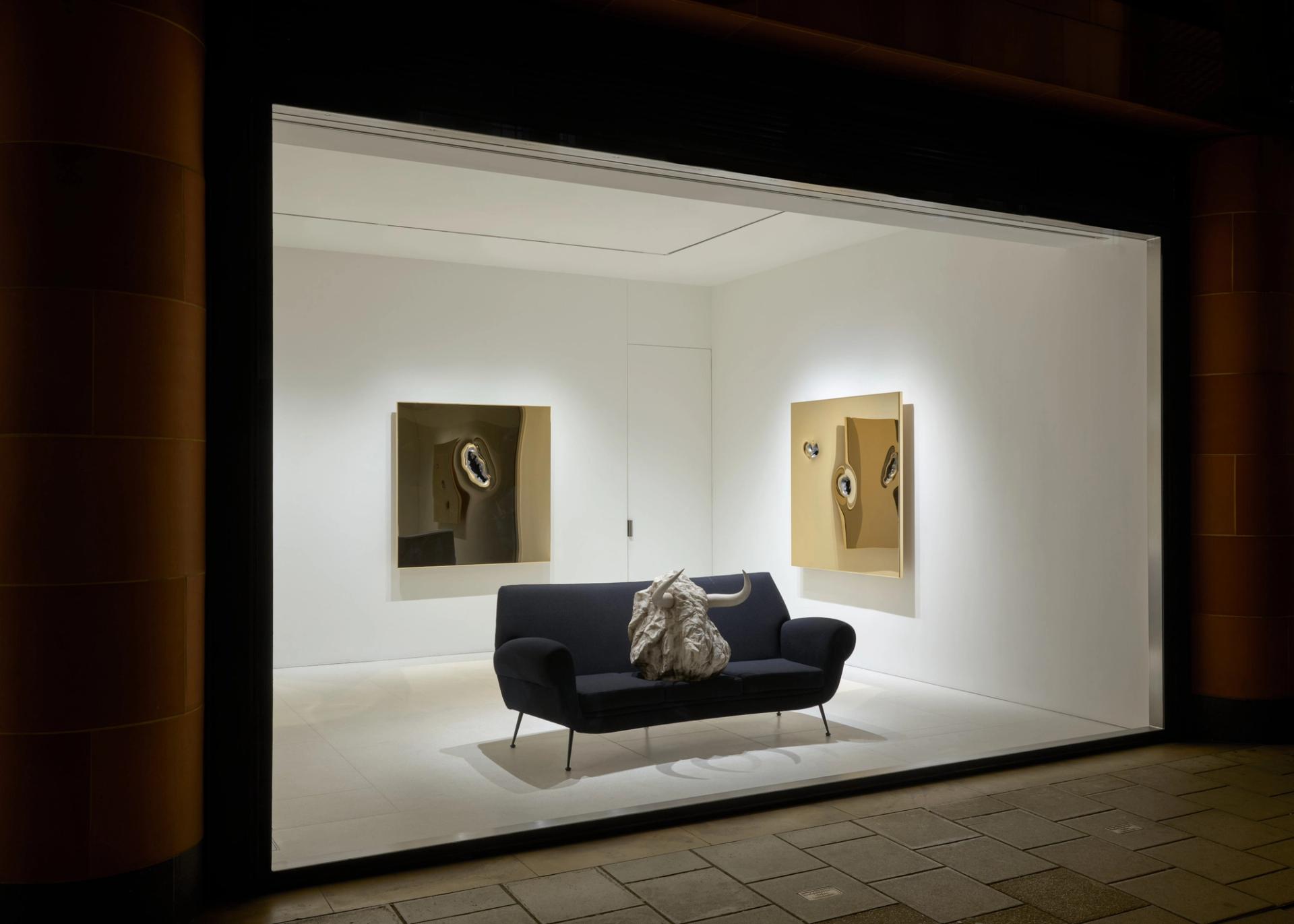 A series of stainless steel panels, plated in 24-carat gold, have been transformed by one or two gunshots, resulting in crater-like creations. The works recall the piece Sunday, 2024, shown at Gagosian New York in April last year, comprising 64 stainless-steel panels dotted with thousands of bullet holes.