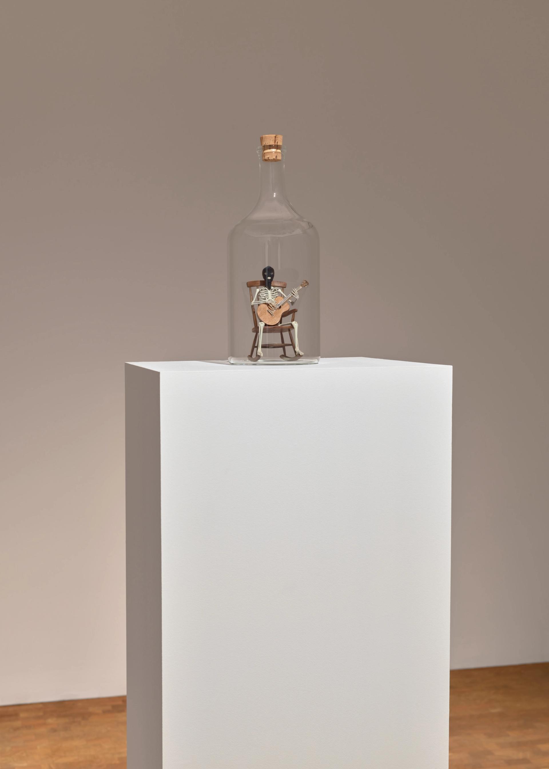The latest destroyed panels are shown alongside a sculpture comprising a Carrara marble boulder topped with a pair of horns, perched atop a couch (Notre Dame, 2025). A sculpture of a guitar-playing skeleton, placed inside a bottle (Deaf, 2025) is both macabre and comical.