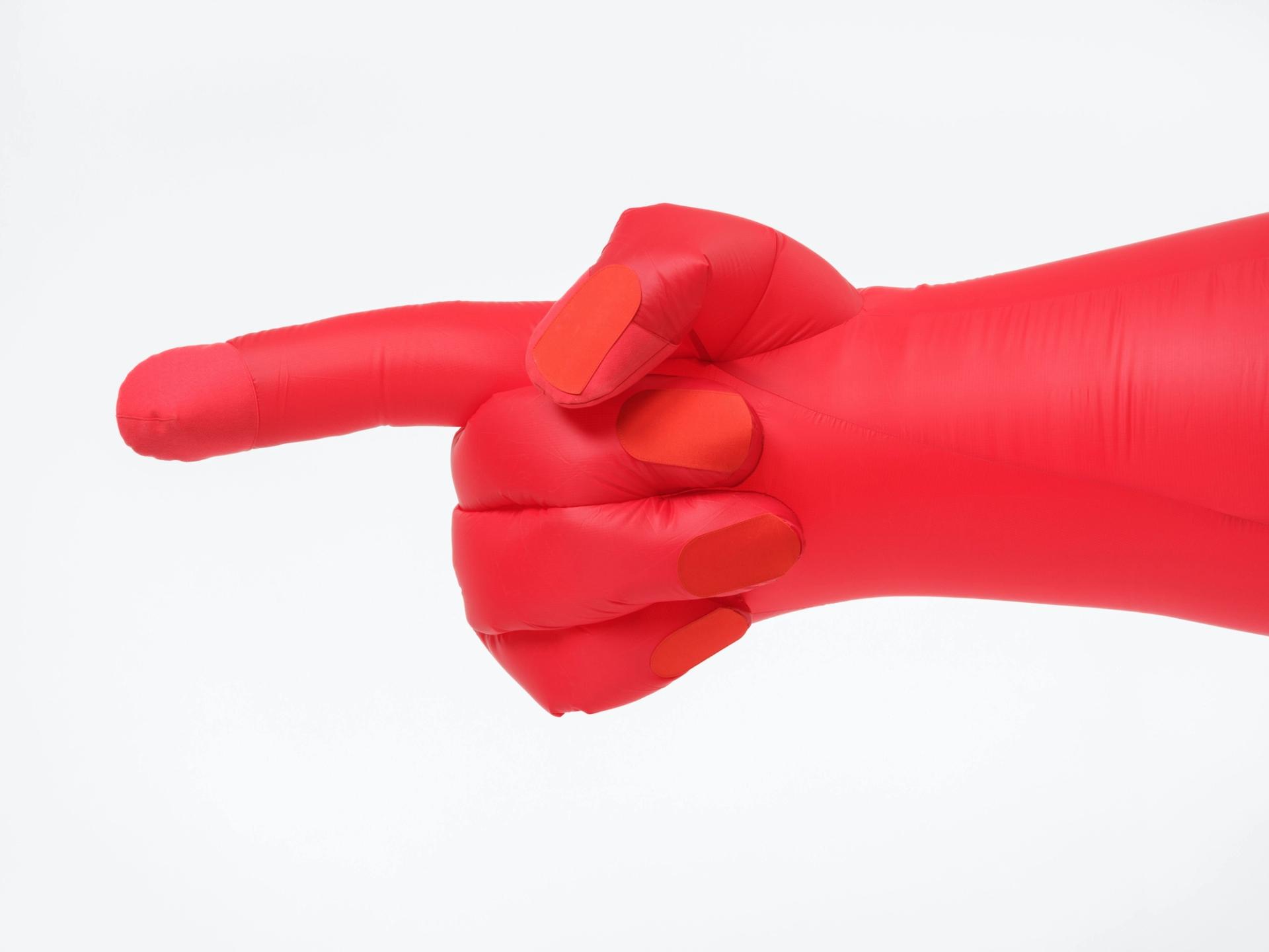 CSK: I mean, that's a really interesting perspective. Yeah, you could definitely say that. There's a Deaf way of getting attention, which is very physical. And it involves tapping somebody on the shoulder, for example. And let's say somebody has been tapping your shoulder for a long time, over a long period of time. You might imagine that there would be an erosion of sorts, an indent in your shoulder to exemplify where it has been touched so frequently. And maybe even some pain associated with that. So if you envisage that and this idea of erosion, well, [it’s] the act of resistance, a continuous resistance. So when you're pointing to something, you're bringing attention to it. You're saying, look at this thing, look at this thing that I'm pointing at. This is the idea of the one hand, the right arm in the exhibition that is pointing at Milan. And then you can see a divot in the wall, the erosion in the wall from all this pointing. And then the other hand that's waving, is more about getting attention, or saying, “Hey, I'm talking to you”, right? So when it starts to wave, the up-and-down movement is quite subtle, and then it gets more and more prevalent. And you can see over time the frustration just building up, building up, and then it starts to dissipate. And then it just stays in that one spot as it's causing friction against the wall. So Tom and I just explained this piece a little bit more. We made the arms red, which is the colour of attention, of alerting, right? So that's why we went with the red for the arms.