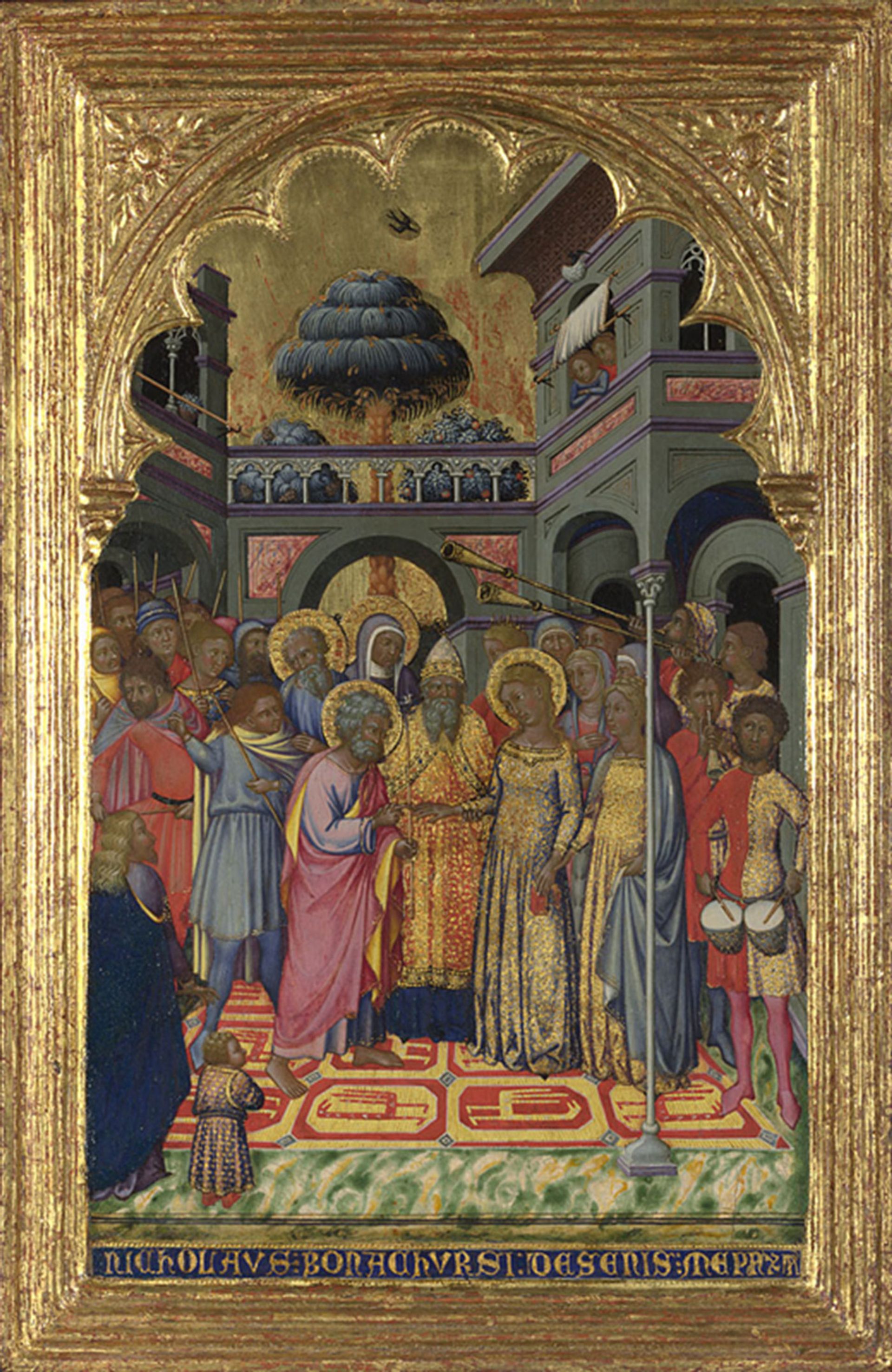 Niccolò di Buonaccorso, The Marriage of the Virgin (around 1380). The carpet demarcates the exalted zone within which the wedding of Mary and Joseph takes place National Gallery London