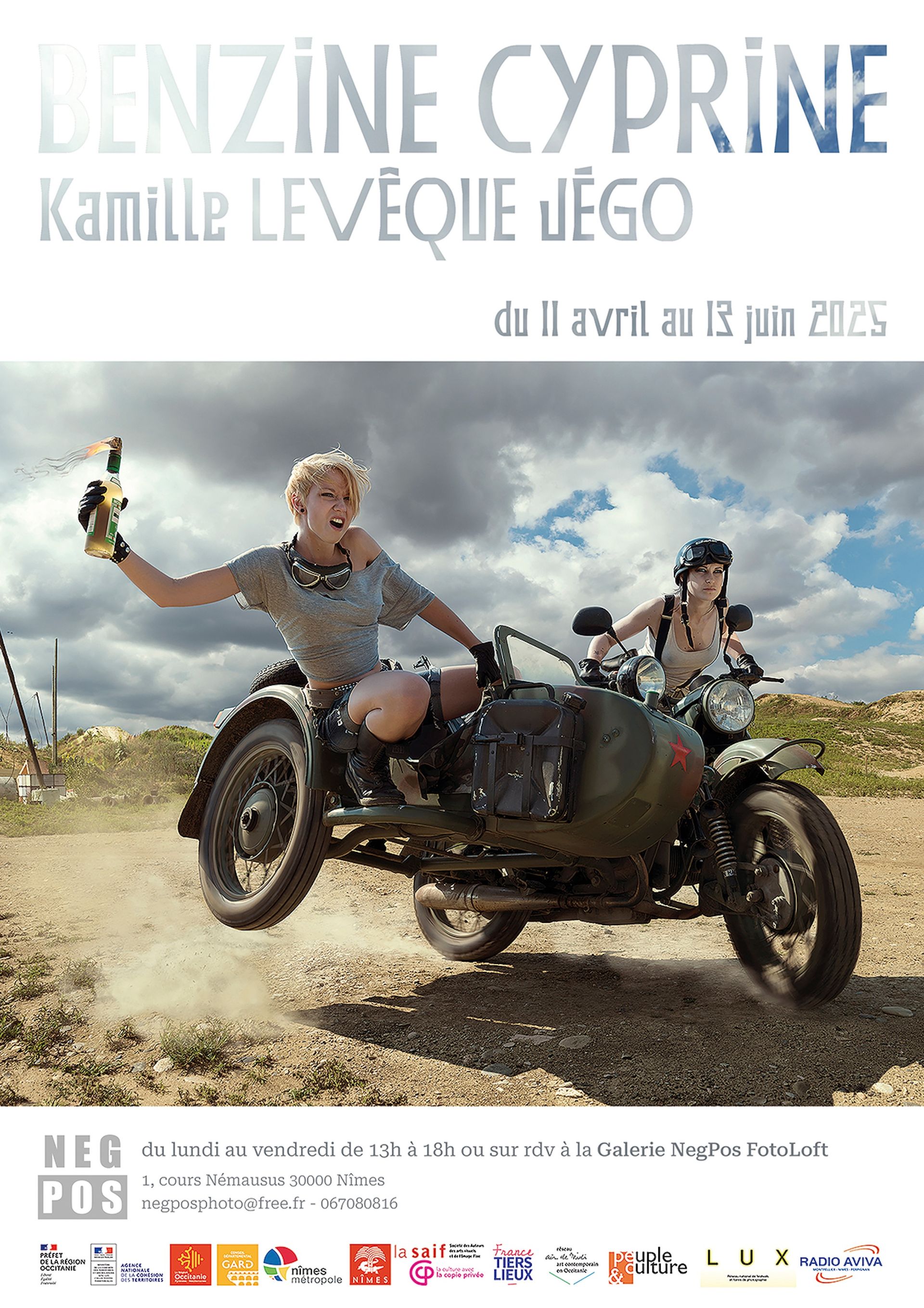 Cyprine Benzin is a work in progress, which Kamille Lévêque Jégo started in 2014. Using photography and video, it follows a “gang of girls” asserting their “flamboyant femininity”. On her website, the artist says she is using the techniques of advertising and pop culture to inform the project. The photograph used for the exhibition poster features two women on a motorcycle—in a scene evocative of war films and dystopian action movies like Mad Max—one of whom is preparing to throw a Molotov cocktail. The work was shown without recorded incident at other events in southern France, such as the Manifesto festival in Toulouse in 2018, where it received an award; the Rencontre d’Arles photography festival in 2019; and, in 2023, at the Nuits Photographiques de Pierrevert.