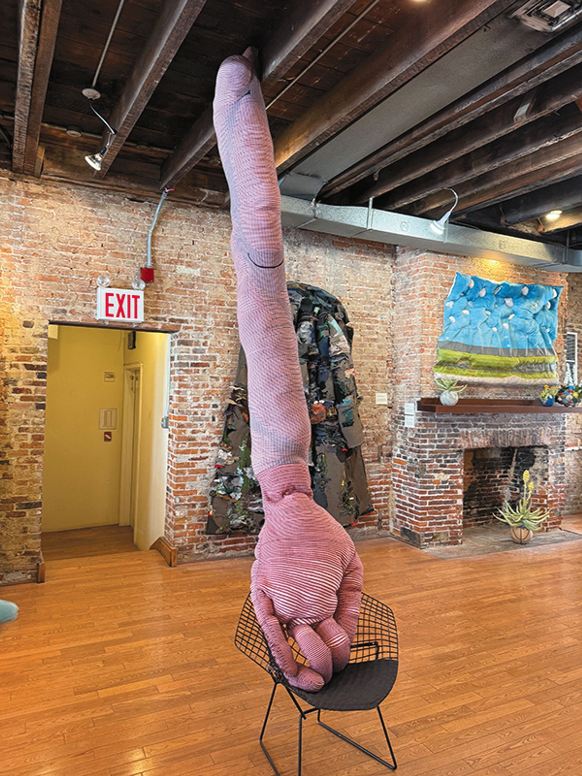 One of the best things about The Golden Thread 2, a pop-up exhibition of innovative textile art in the historic South Street Seaport (until 16 May), are the accompanying wall texts that tell interesting backstories with colourful details. A huge pink arm—Put (2024) by Felix Beaudry—dominates one of the vast gallery spaces. “I like a big arm, because it implies, and occasionally executes on, a big hug,” Beaudry writes in a frank (and rather cuddly) text. Others are more poignant. Trish Tillman’s says, for instance, that her work, The Location of Your Grief (2025), is inspired by “the essence of my grandparents’ basement bar: a place of solace and discovery in my youth”. The eye-catching, engrossing show is staged by BravinLee Programs.