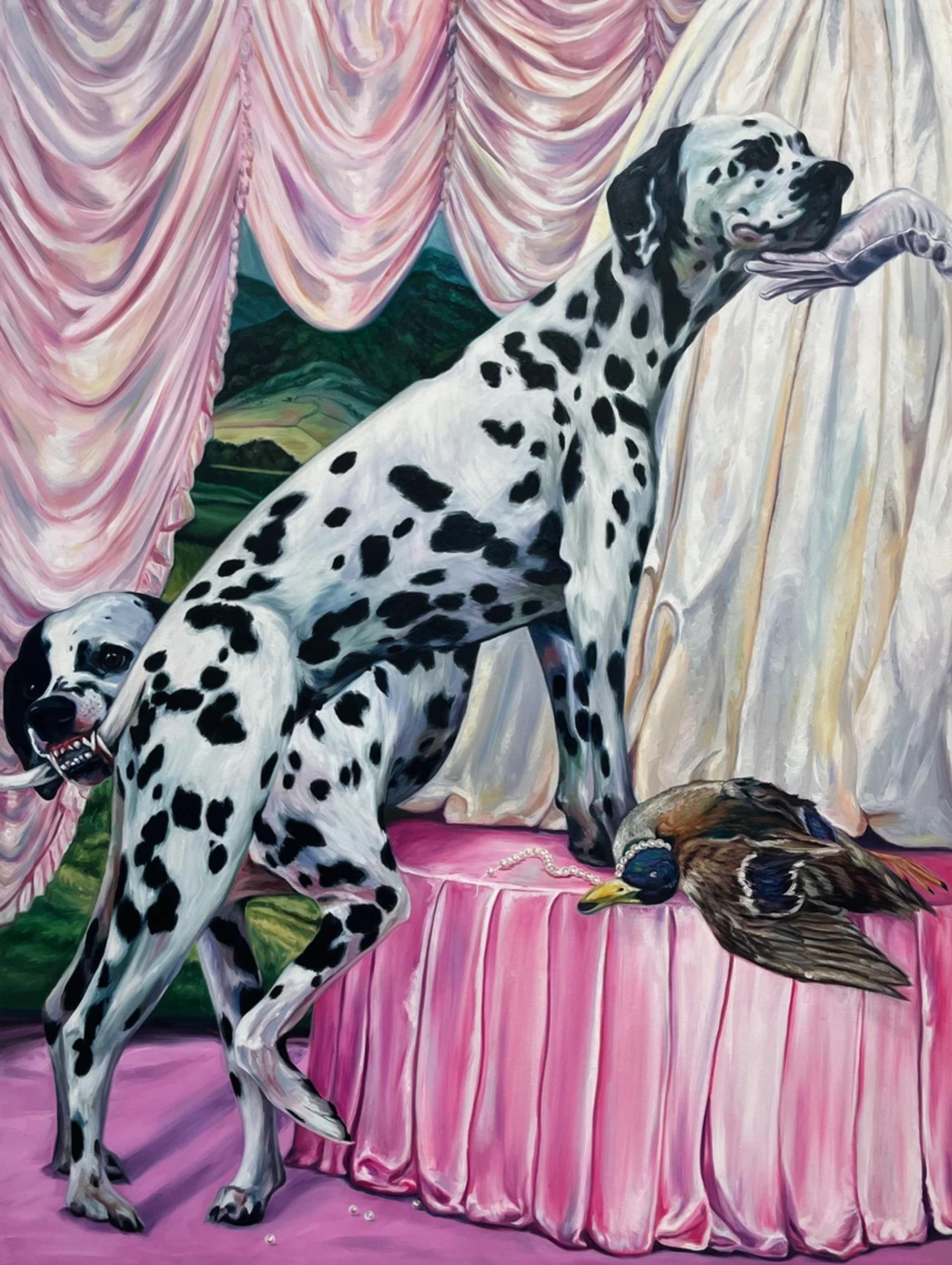 The Missouri-based artist Catie Cook's fabulously furry sitters operate as animal stand-ins for her lived experience of womanhood in the American South. Cook’s portraits of high-femme Dalmatians, on view at Harsh Collective's stand, explore the violent undercurrent of the elegant, aesthetic dog breed, a metaphor for Bible-belt feminine social rituals.