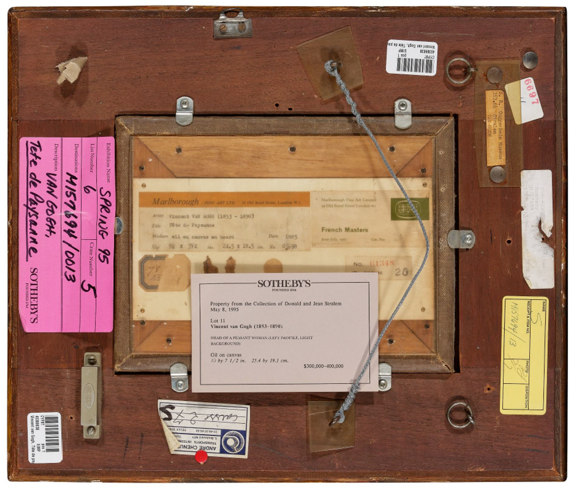 An unusual view of the reverse of the framed Head of a Peasant, with labels of exhibition venues and the art trade