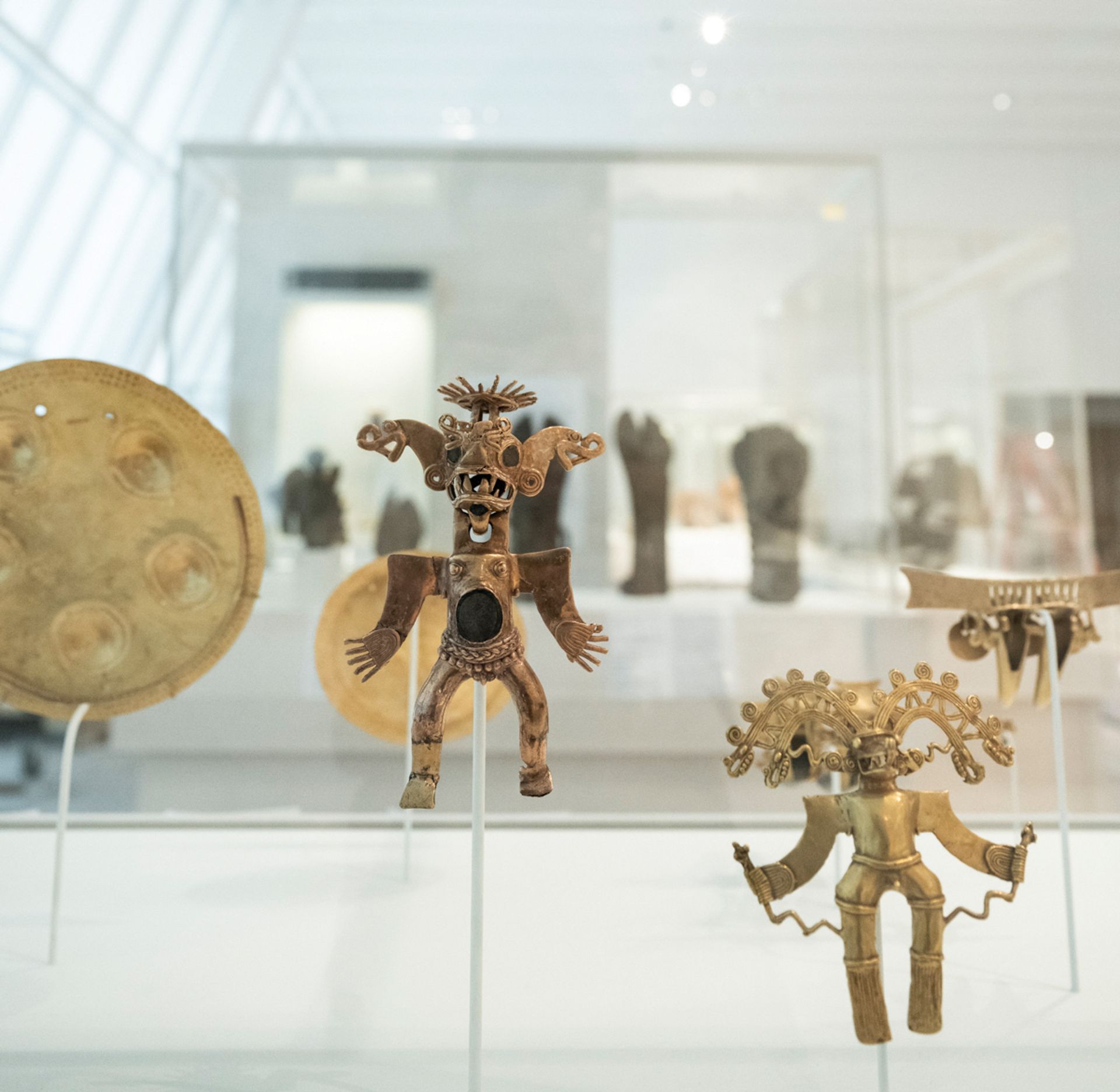 Long, diagonal installations from the Oceania galleries to the Americas and back to Africa now create a cohesive visual narrative leading visitors to make their own discoveries. Previously, people may have overlooked the collection of tapestry-like blue and yellow panels that, on close inspection, reveal themselves to be made of a quarter of a million bird feathers from the Amazon rainforest. These look Bauhaus Modern in a wall case at one end of a low-lighted interior space dedicated to Andean textiles, the first of its kind in the country.