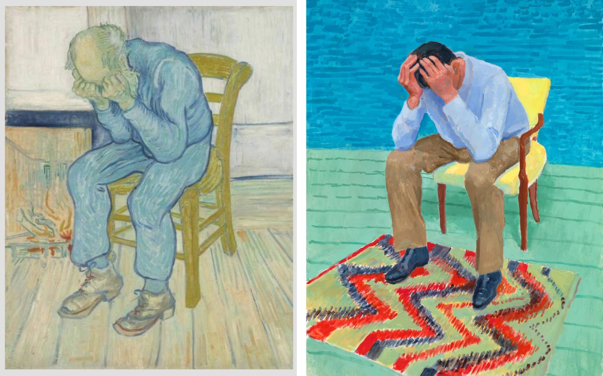An internet image of Van Gogh’s Sorrowing Old Man (April 1890) and Hockney’s J-P Gonçalves de Lima, 11th, 12th, 13th July 2013 (2013-16)