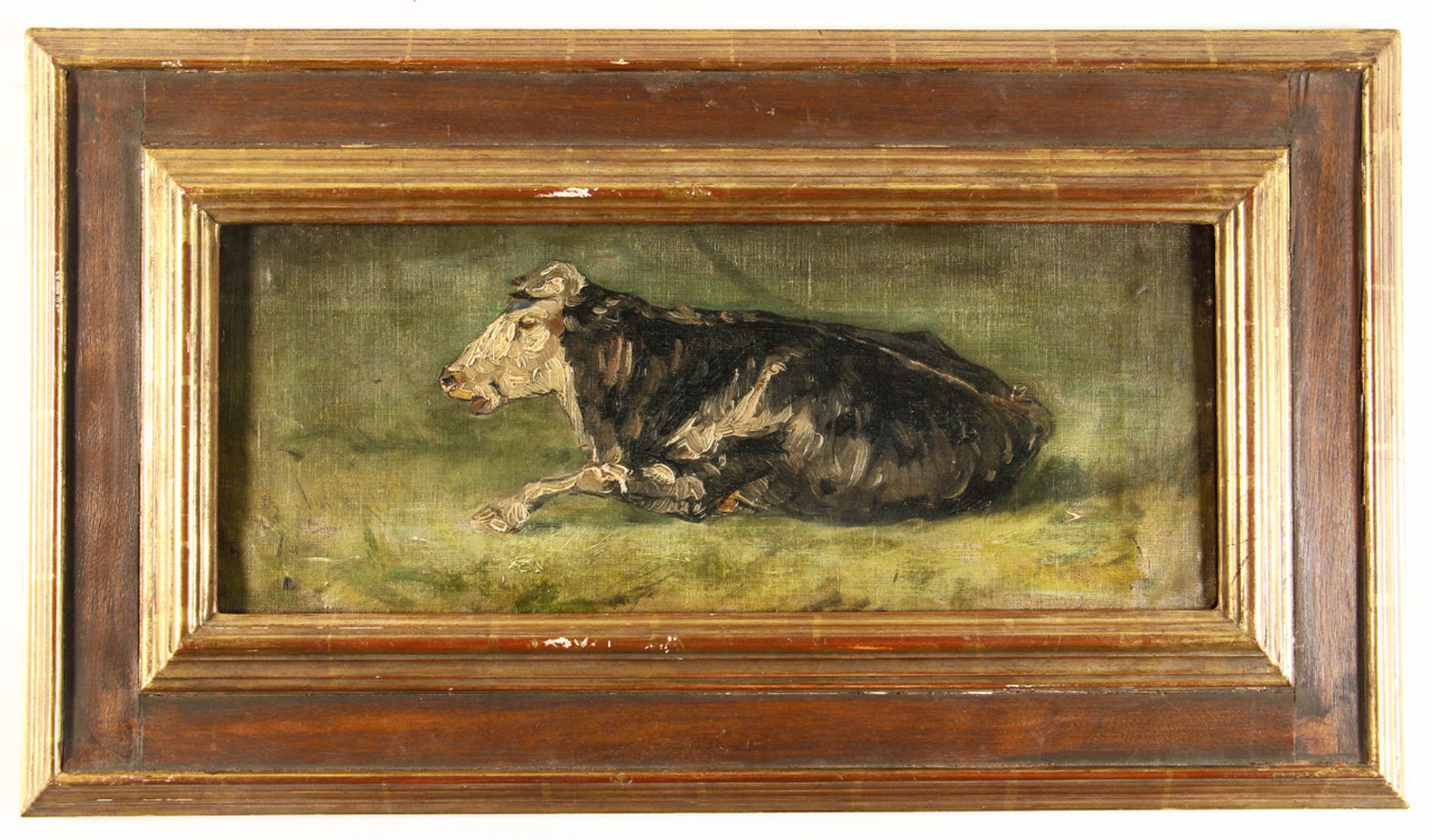 Although Lying Cow (possibly 1882-83) was accepted in the two Van Gogh catalogues raisonnés by de la Faille (1970) and Hulsker (1996), it is now doubted by the Van Gogh Museum in Amsterdam. The Bubb Kuyper catalogue entry openly states that the museum’s examination “casts doubt on the authenticity of the work”, although they “cannot with 100% certainty declassify it as a work by Van Gogh”. There are two other Van Gogh paintings of cows, one of which is assumed to be authentic (selling for $2m in 2008) and the other is known only from an old black-and-white reproduction.