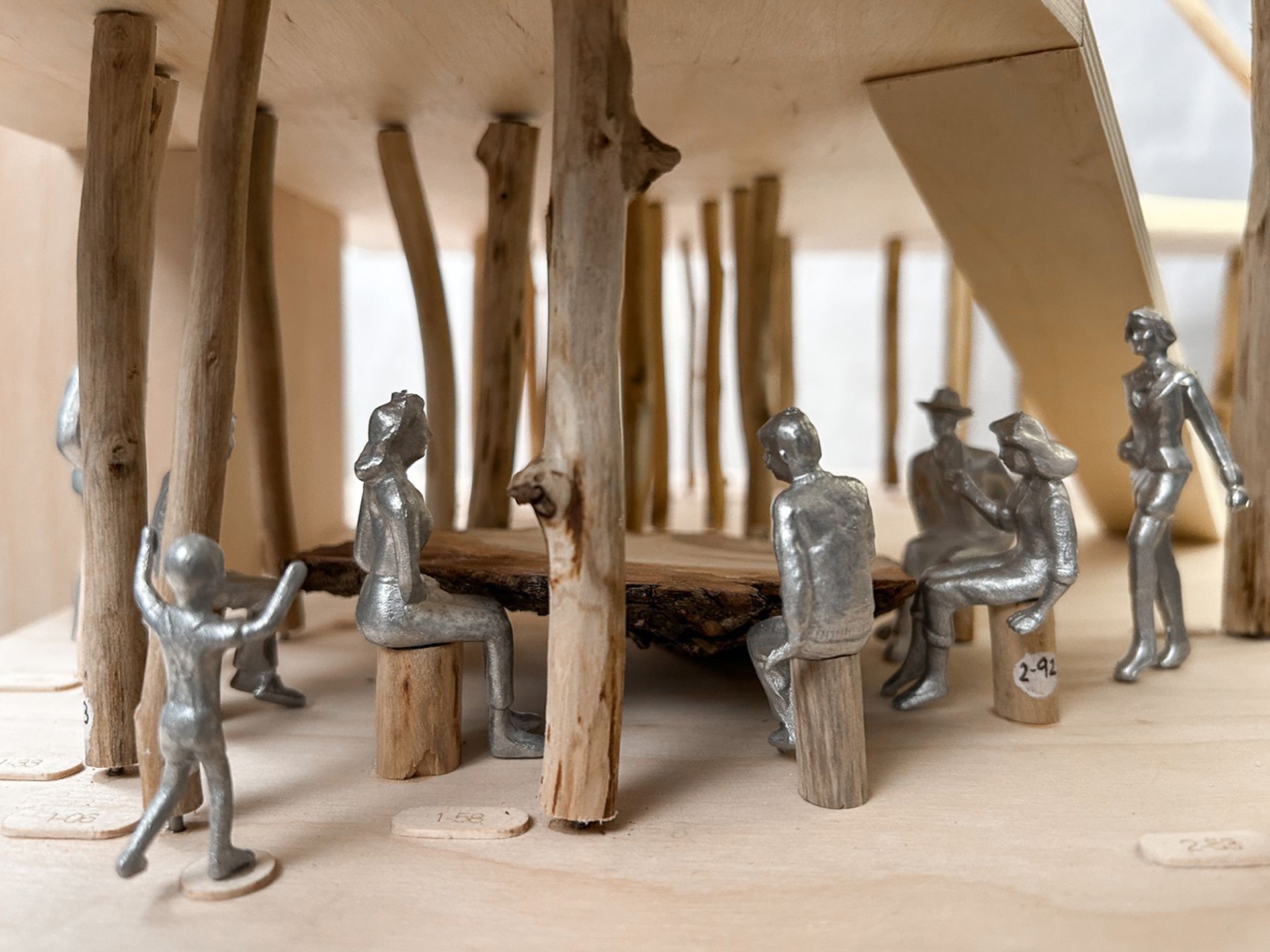 Showcasing alternatives to milled wood beams, which generate considerable waste, several exhibits feature structures built from whole trees. The irregular forms have been optimised for assembly and stability through 3D scanning and artificial intelligence.