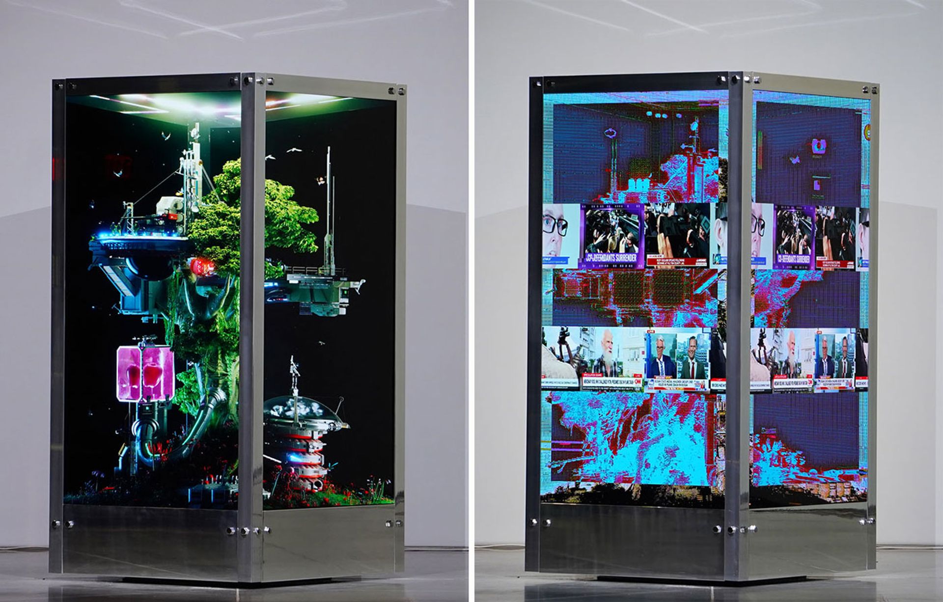 Signal and Noise: Beeple's sculpture The Tree of Knowledge (2024) in "Signal" mode (left) and "Noise" mode. In the latter, news feeds and other images symbolic of media overload obscure the view of the tree itself © Beeple Studios