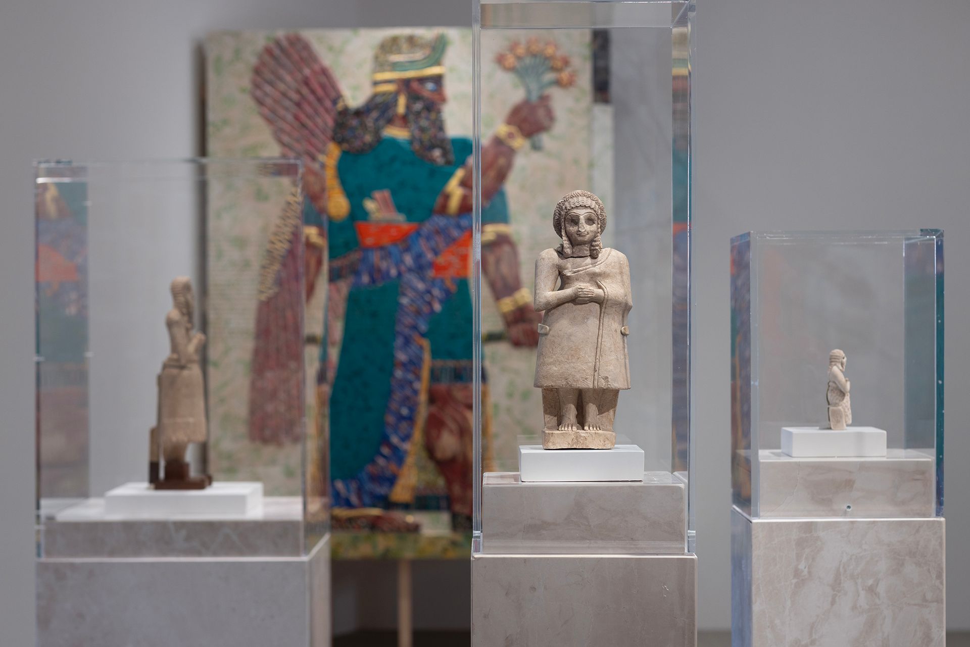 The 14 historical artefacts on display are predominantly standing figures or fragments of figures, among them a headless female figure with clasped hands from Sin Temple IX (2700-2500 BC) in Iraq.