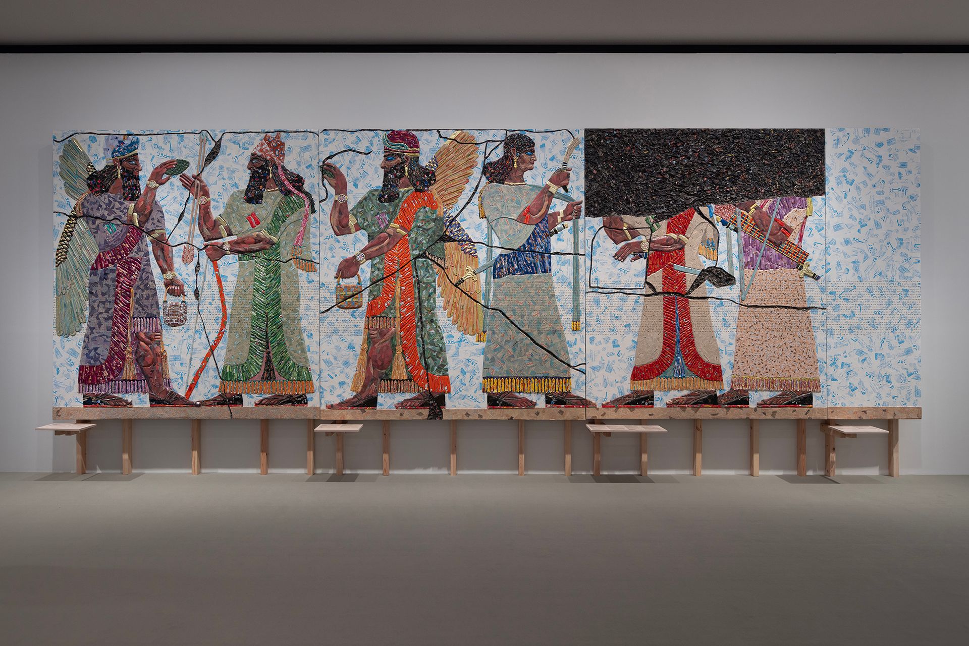 Installation view of panels from Michael Rakowitz’s The Invisible Enemy Should Not Exist (2019)